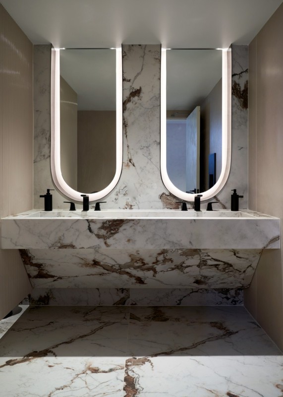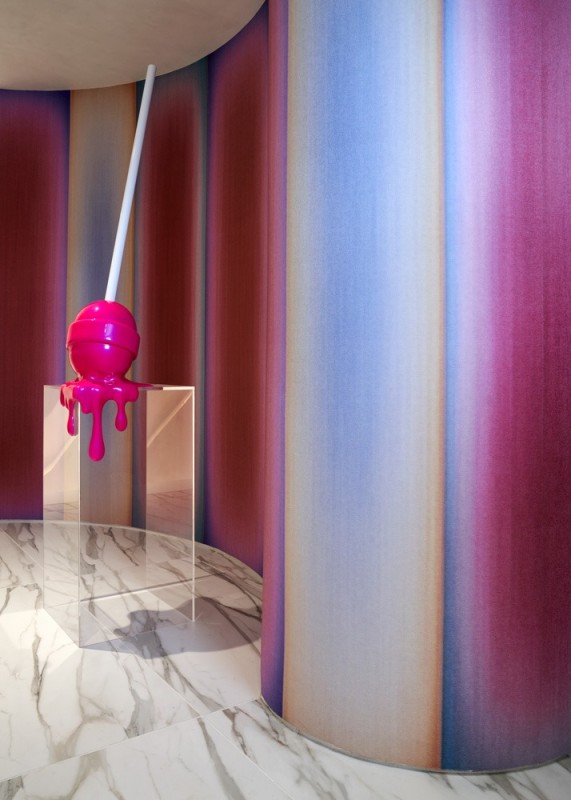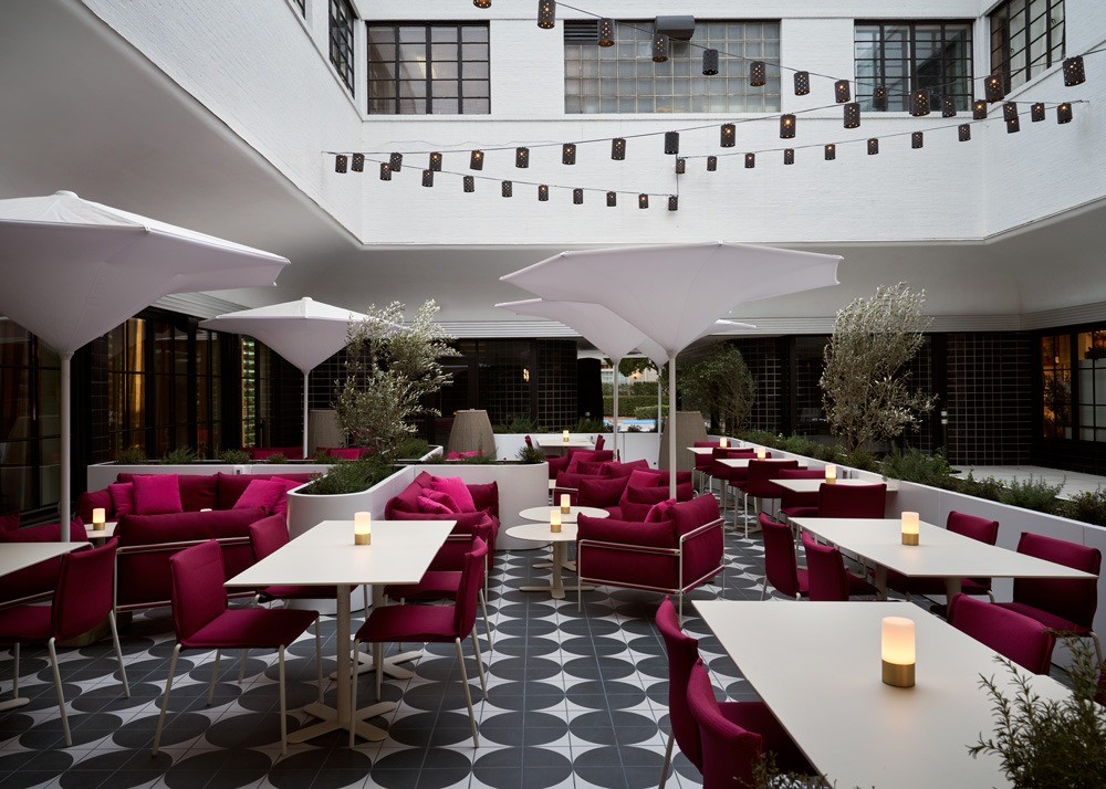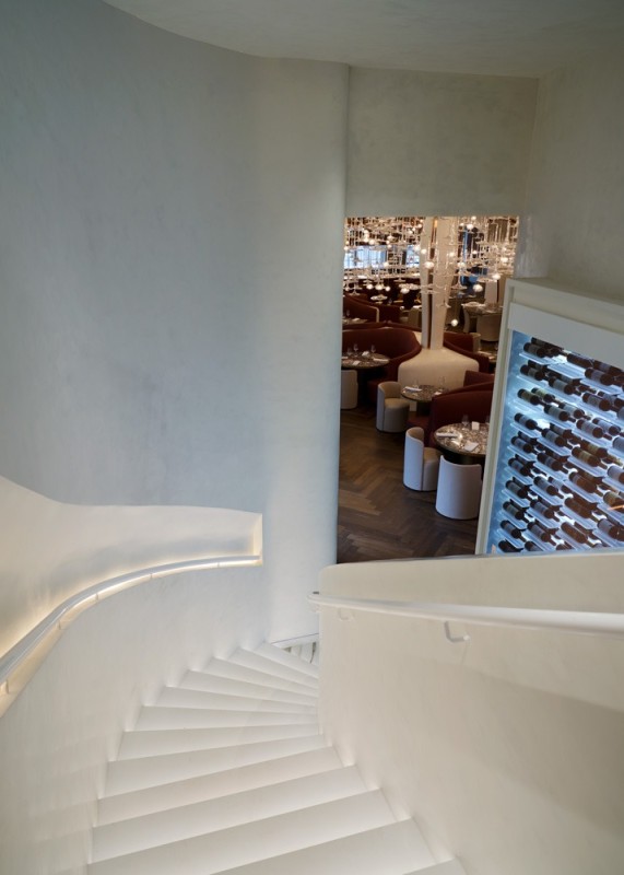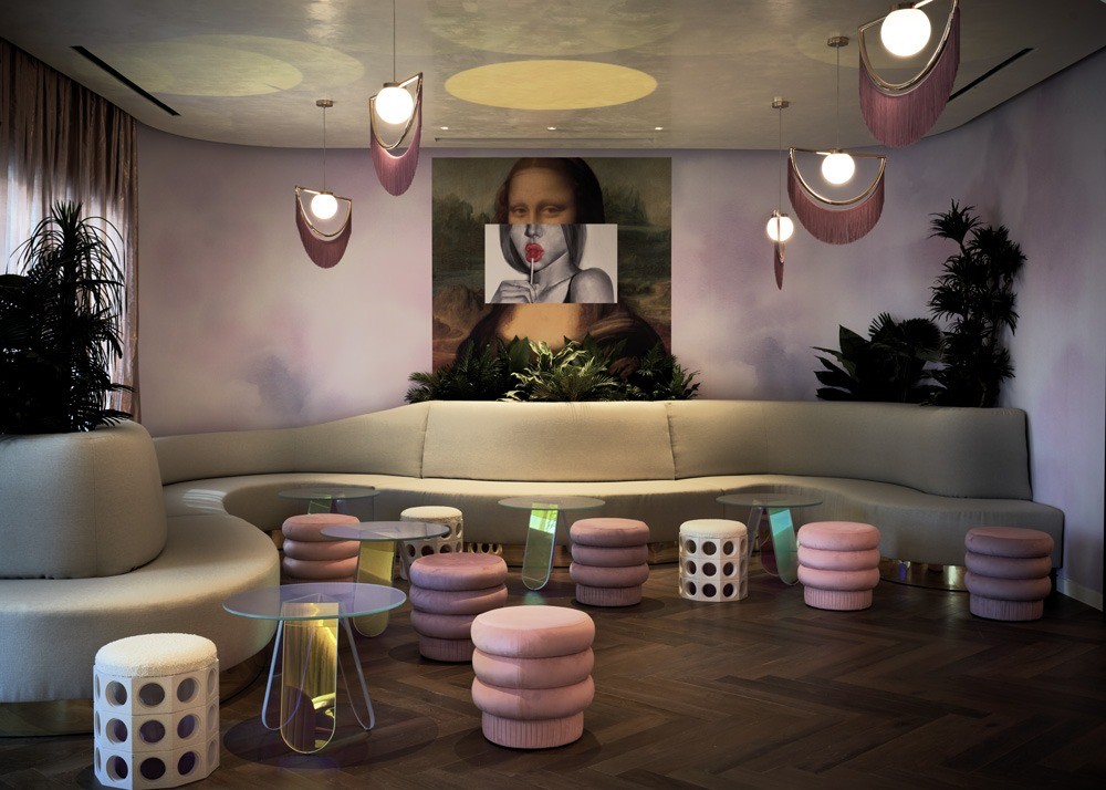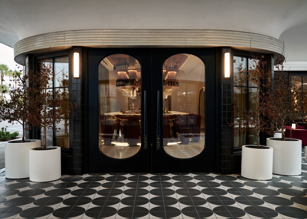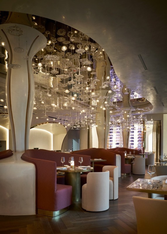 Wittman worked with Nina Magon Studio to create the vision for the interiors. The result is a mix of sophisticated elegance and whimsy adorned in pinks and gold and polished metals. Every surface is curved, including the golden horseshoe-shaped bar that was inspired by the Plaza Athénée in Paris, one of Edith’s favorite places. A sparkling canopy of crystal lights provides a soft glow in the main dining room.