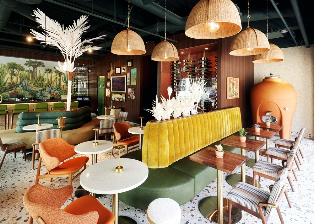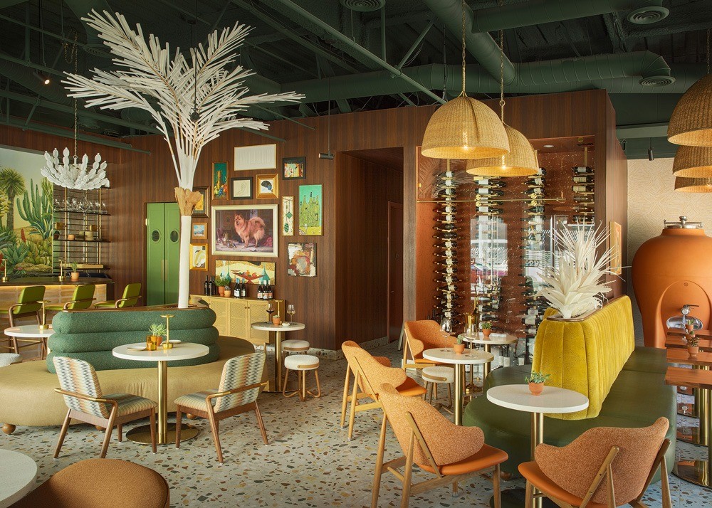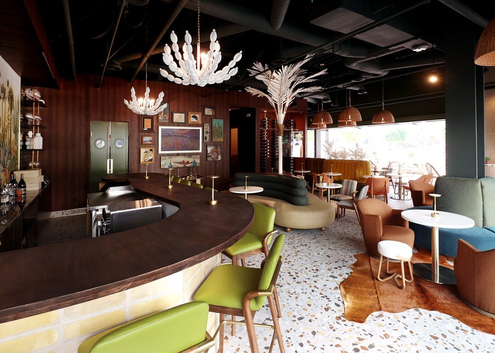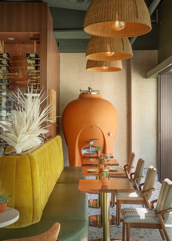 The natural tones with pops of color are found throughout the space, a hallmark of mid-century modern design. Terracotta oranges, greens and browns are interspersed with shots of yellow, blue and white, making the space very modern and clean. “We wanted to use deep saturated hues that were inspired by the earth because wine comes from the earth,” Kennedy says.