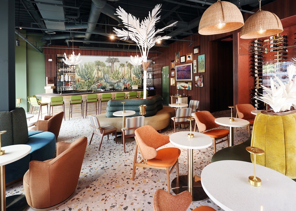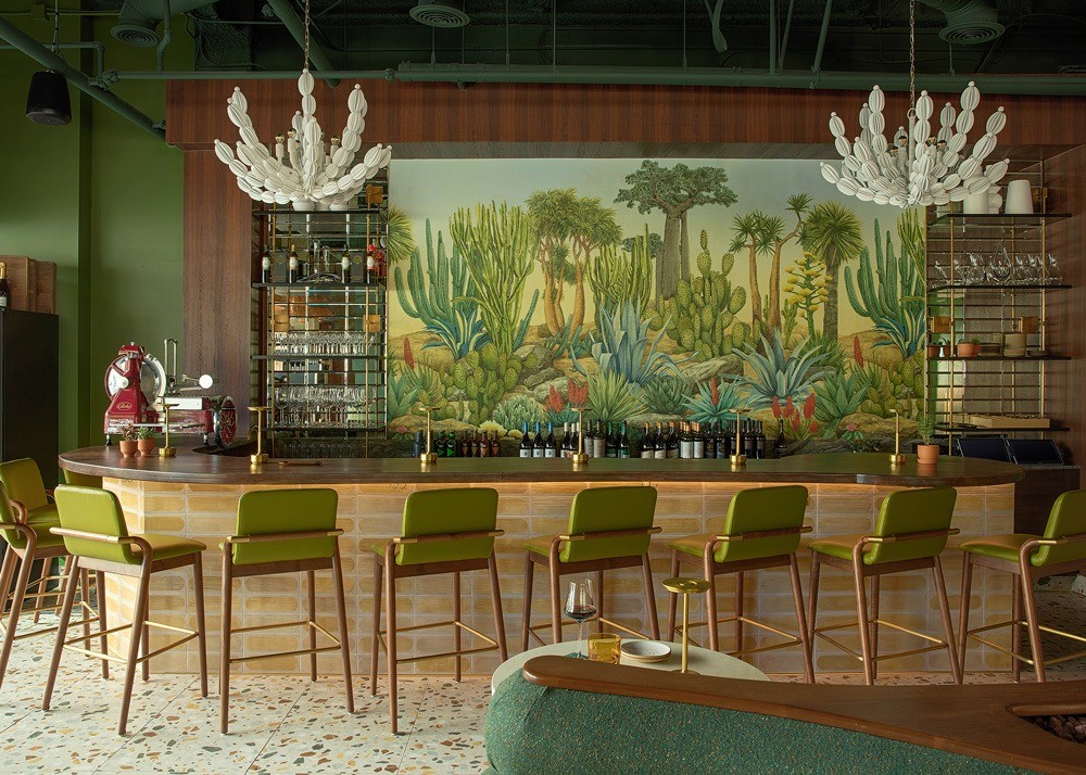 Canopy’s defining feature is a large desert landscape that covers the entire back bar. This image features native cactus and plants in natural tones with pops of red desert flowers, echoing the look of red wine. The mural was painted for the lounge then printed on wallpaper and applied, but it looks like a mural.