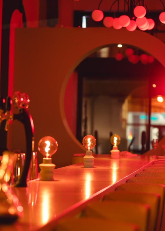 And adding to the femininity and also evoking wine bottles, there are curves everywhere — in the pill-shaped cut-outs in the back bar (which hold bottles and glasses); in a big circular cut-out by the front seating area that allows passersby to look straight into the space and see the bar; in curves that are painted on the wall at the front; and in curving metal tubes reaching across the ceiling from the back bar to a retail wine area opposite, reminiscent of the metal bands around wine barrels.