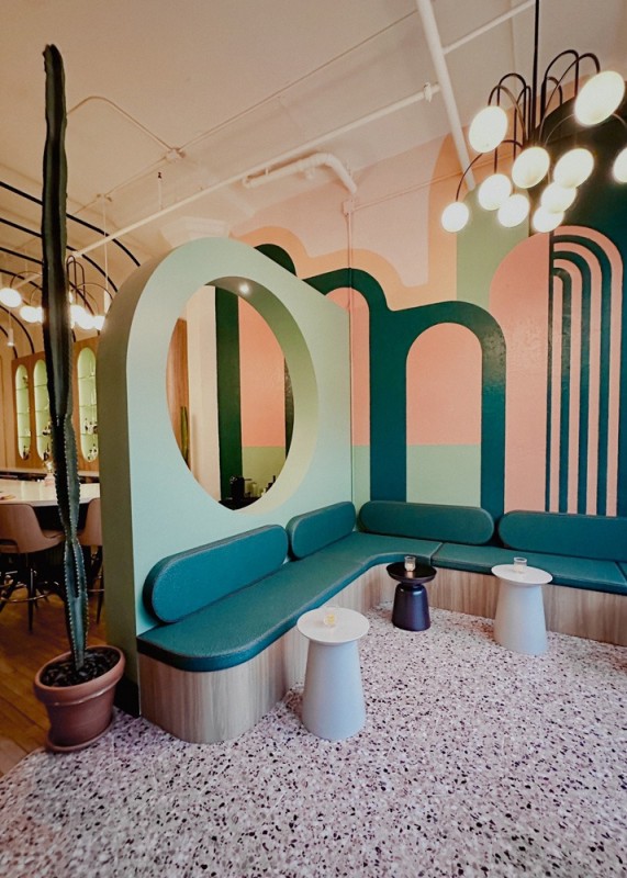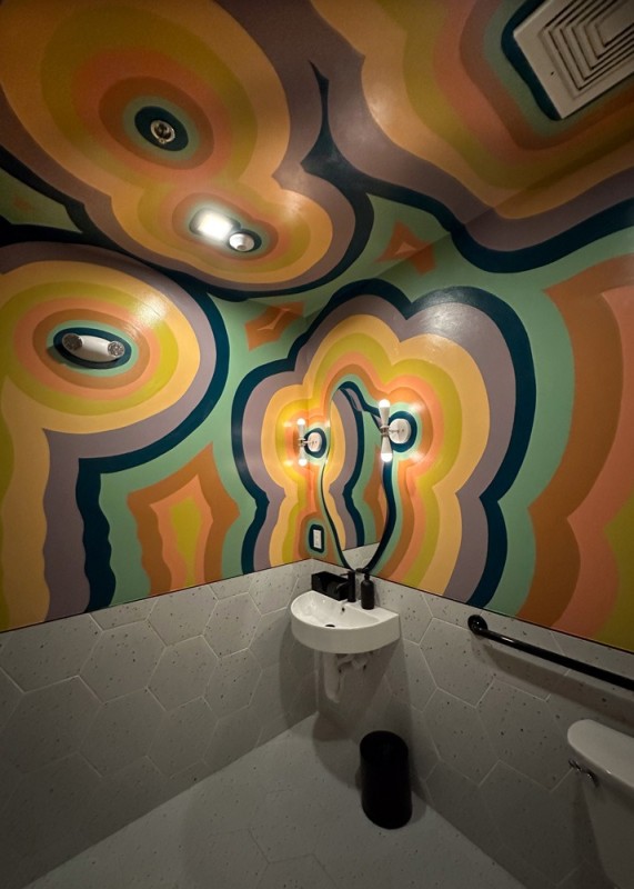 Murals are a strong element at Joui, with a modern design at the front seating area, and eventually, another one toward the back. “We enjoy letting a space breathe when it initially opens, so we deliberately leave areas to be completed as the business finds its personality and needs,” Roddick says. There are also murals in the bathrooms, where a bright, cheerful and very modern design covers the walls and ceiling.