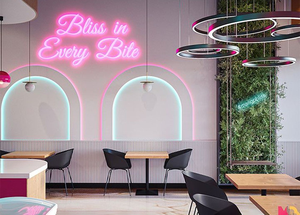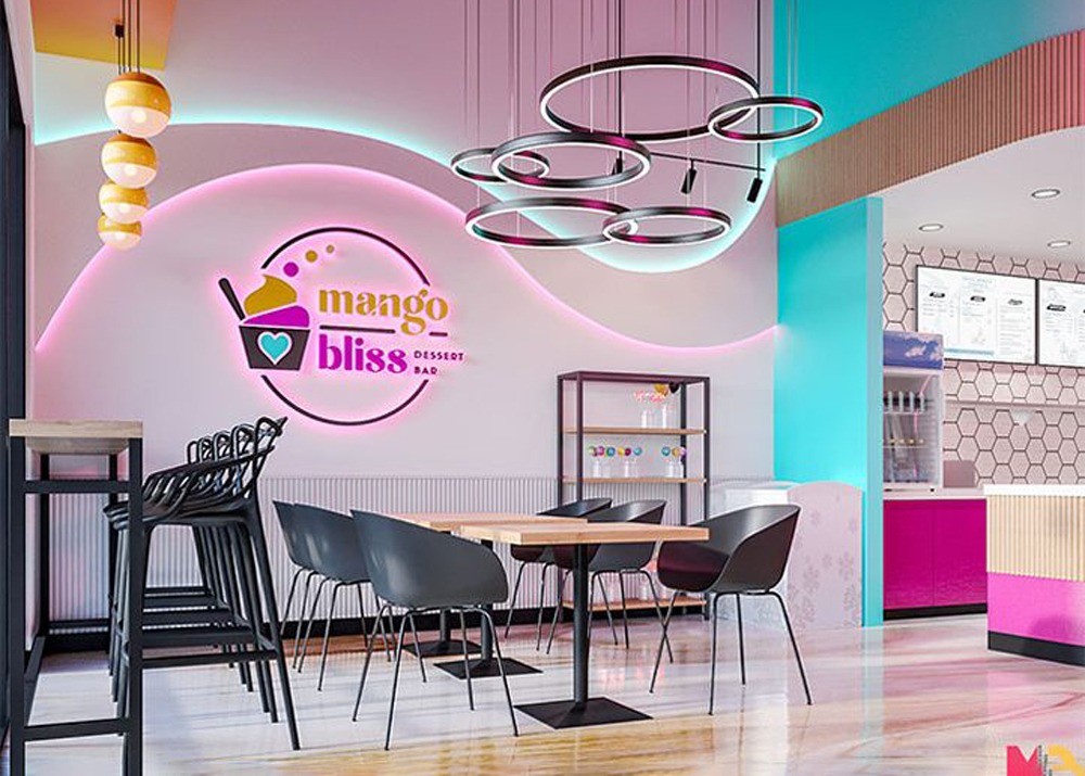 Mango Bliss Dessert Bar, which serves ice cream, seasonal treats and more, will debut this month in Prescott, Ariz. The playful design of the space features vibrant colors and a neon sign that reads, “bliss in every bite.”