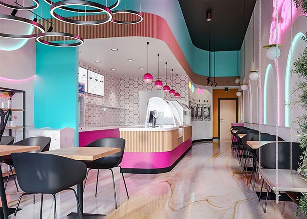 The overall design features vibrant fruit-inspired colors, playful neon lights and a variety of seating options. Guests will be able to choose from tables situated under pink and blue LED arches, or a counter-height table with bar stools for a street-view dining experience.