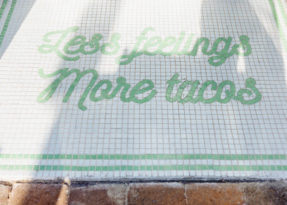 Pasta tile floors handmade in Jalisco, Mexico, anchor the restaurant’s aesthetic. Pasta tile is a term that refers to the type of flooring used in old Mexican homes typical to Yucatán colonial houses. Mosaic tiles bearing the quote “Less Feelings, More Tacos” offer a photo-worthy moment upon arrival.