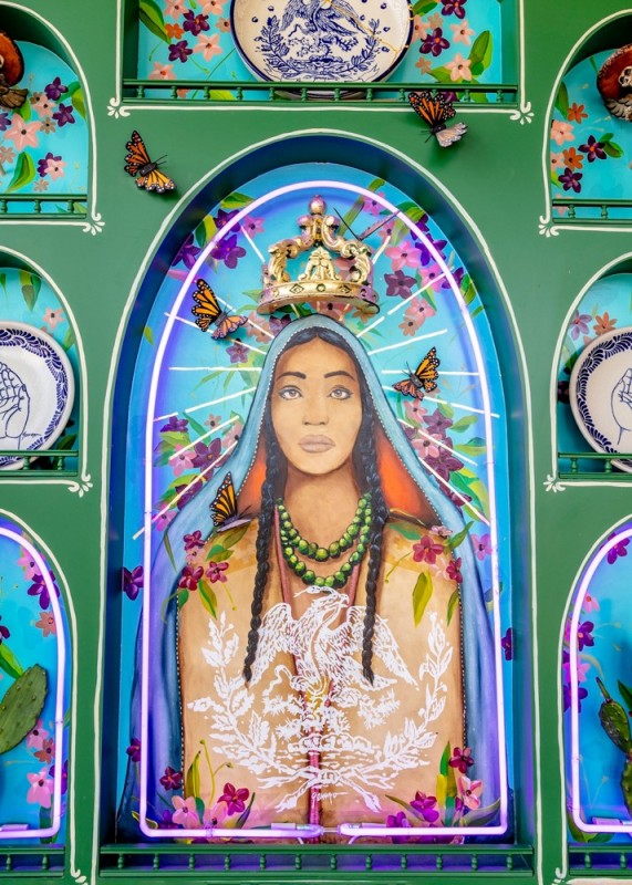 A custom cantina-inspired bar in Cadmium green by the acclaimed Casa Armida is situated near the back of the restaurant, along with bar stools handcrafted by Mexa in Guadalajara. Finally, the pièce de résistance is the “retablo” or altar that displays artwork, sculptures and more.