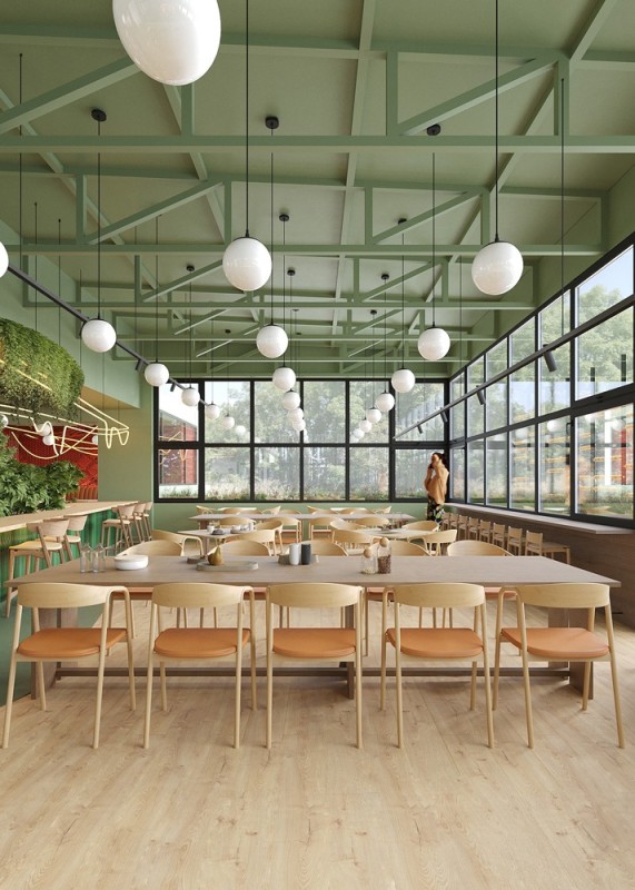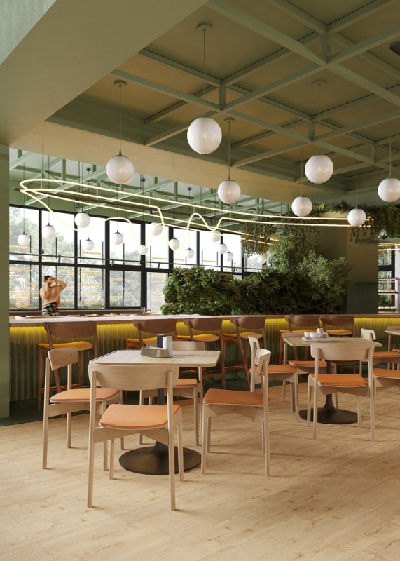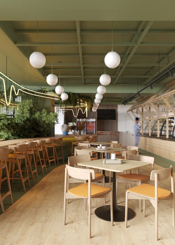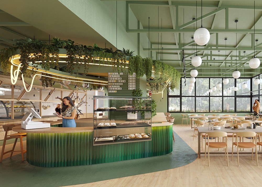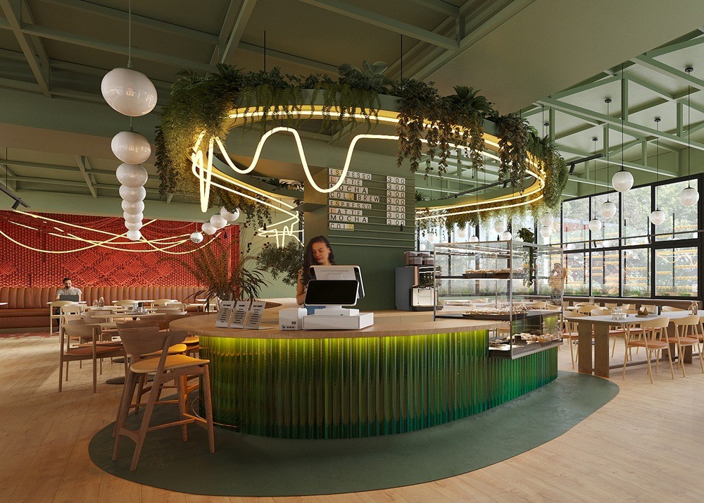The heart of the cafe is an island that serves as both a cashier for their grab-and-go options and coffee bar. The island is made of natural wood and vertical green tiles, reminiscent of tall grass. Atop an ambient overhead lighting display sits live plants.