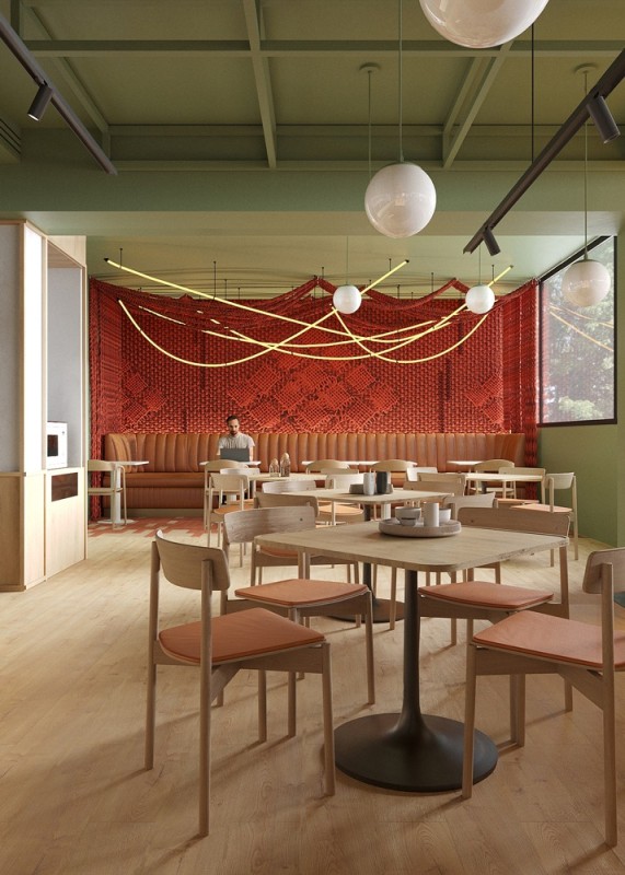 Throughout the space, the ceiling was deliberately left with exposed pipes and ventilation ducts, all painted a muted green. A sand-colored wood floor is featured throughout. There are bar-style seating, four-top tables and a statement-making banquet for guests to choose from. Tucked away in the back of the space is a wall-to-wall banquette. A red woven panel on the wall was crafted to be reminiscent of a hammock or picnic blanket.
