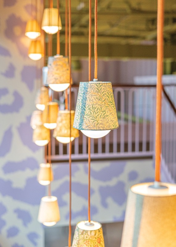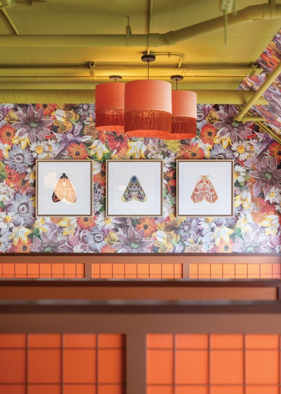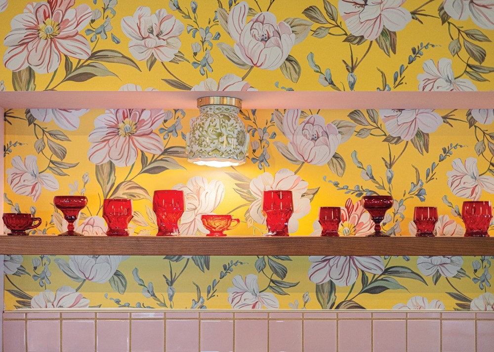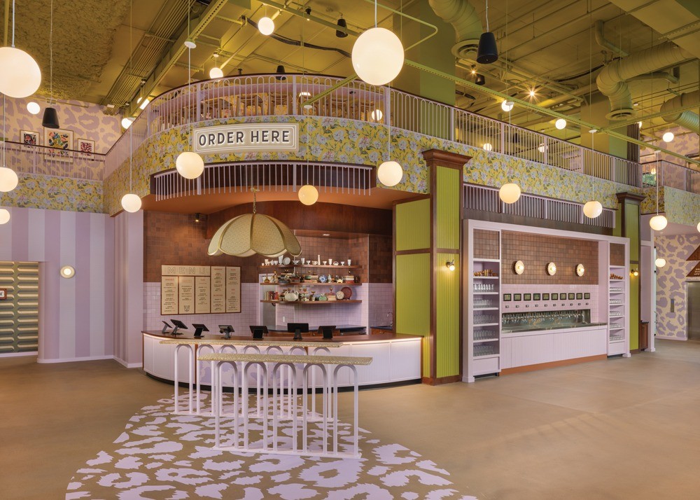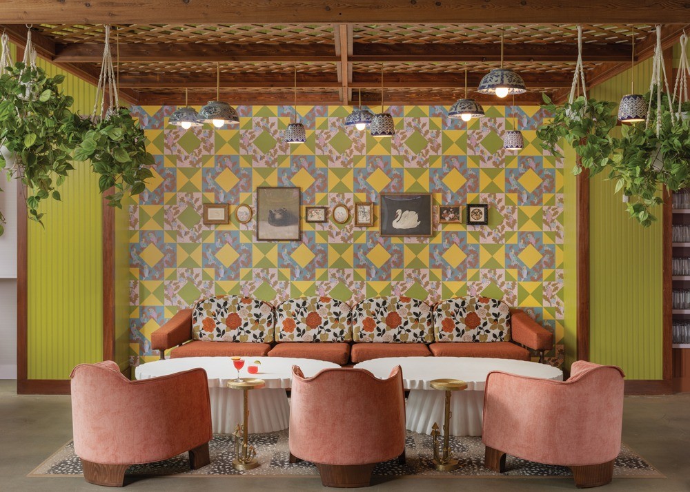 Curved walls, ceilings and details throughout the space play up the femininity of the concept. Woven rattan and garden-basket-style light fixtures are used throughout. Upholstery fabrics are inspired by highly patterned and intensely colored womenswear, including plaid, velvets, hot pink tweed, gingham, floral prints and polka dots. Flowers are celebrated on many surfaces, including wallcoverings, custom light fixtures, restroom wall sconces, custom designed barstools, sofa upholstery and graphic motifs.