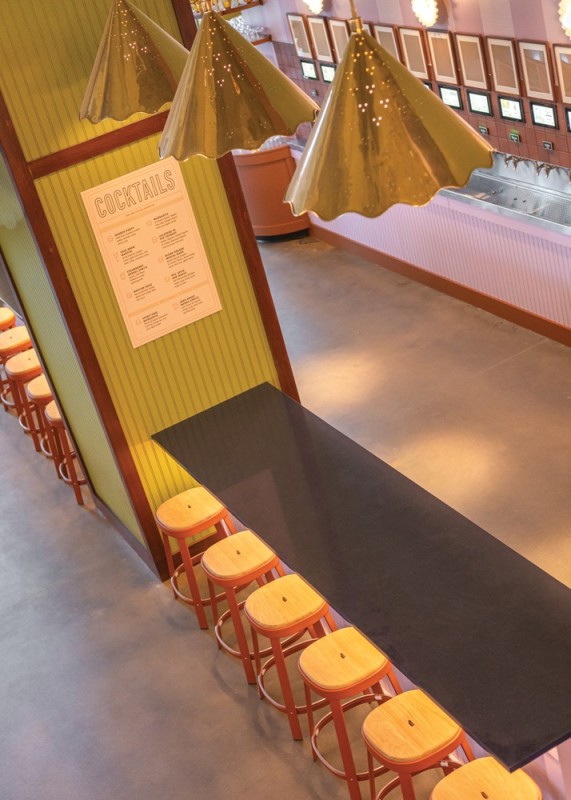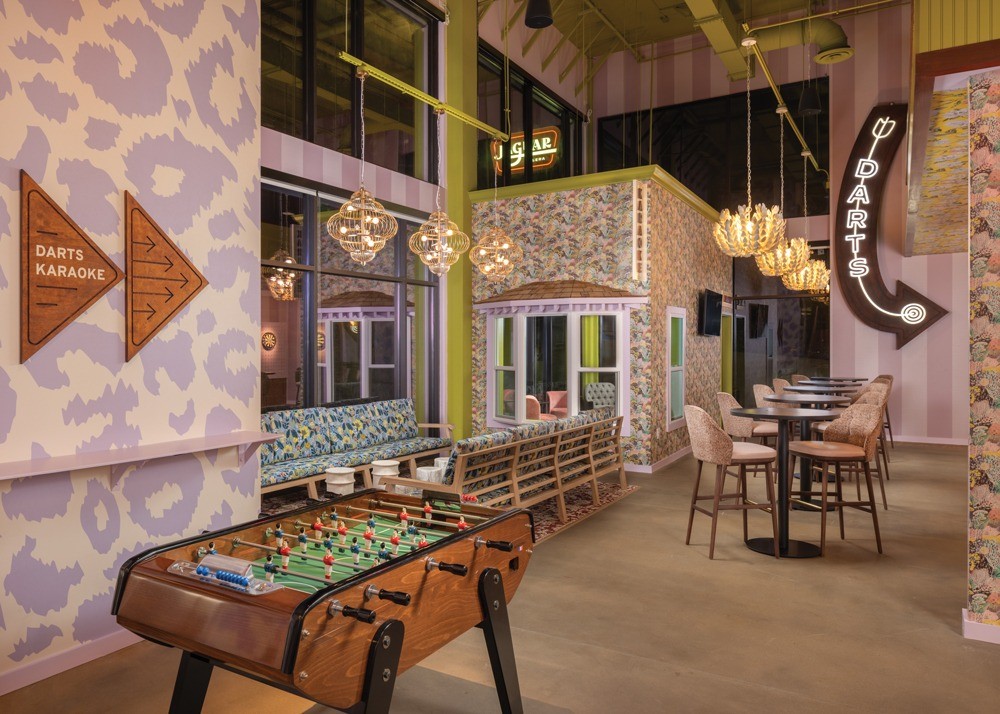 FAM Design worked with entrepreneur Robert Thompson, founder of Punch Bowl Social, to create Jaguar Bolera. The 21,000-square-foot concept offers a restaurant with southern and Mexican menu items alongside duckpin bowling, foosball, darts, private karaoke rooms and three pour-your-own beverage walls with 73 self-pour taps. One unique spin on the eatertainment experience is the addition of a “makertainment” area for DIY endeavors such as macrame, needlepoint, hand tooling and more.