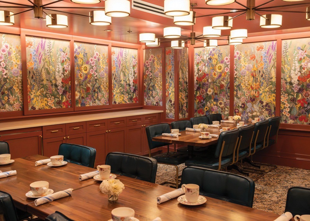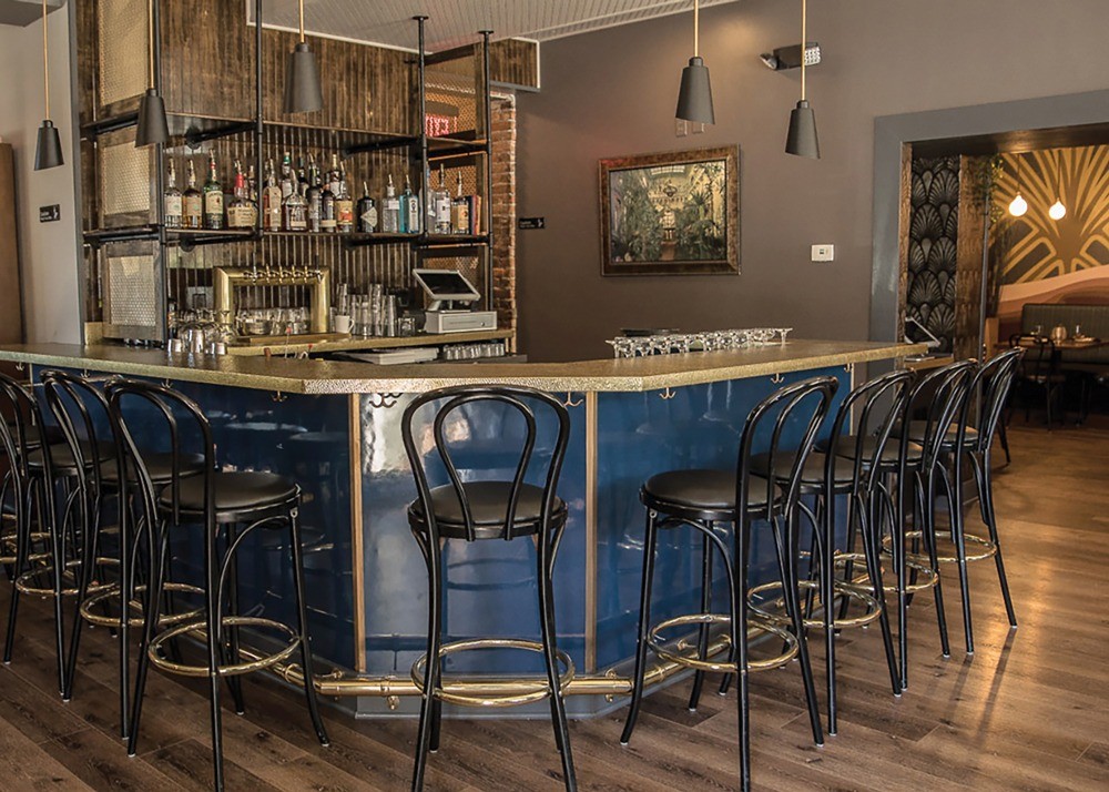 The Rose Garden features a gallery wall above the bar, though there’s a small photo of a little boy — an internet meme — hidden among the pictures, bringing in a playful modern element. And, on each side of the bar are modern pictures “to create a moment of pause so people question their environment and to add a modern touch,” explains Dala Al-Fuwaires, MFA, principal, owner and designer, House of Form, Scottsdale, Ariz.