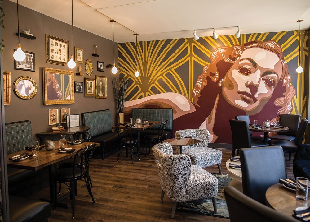 One example is Swift & Sons Tavern in Chicago, which CDA designed in collaboration with AvroKO, where playful, bold baseball terms were layered over midwestern farm-style paintings.