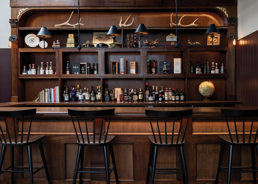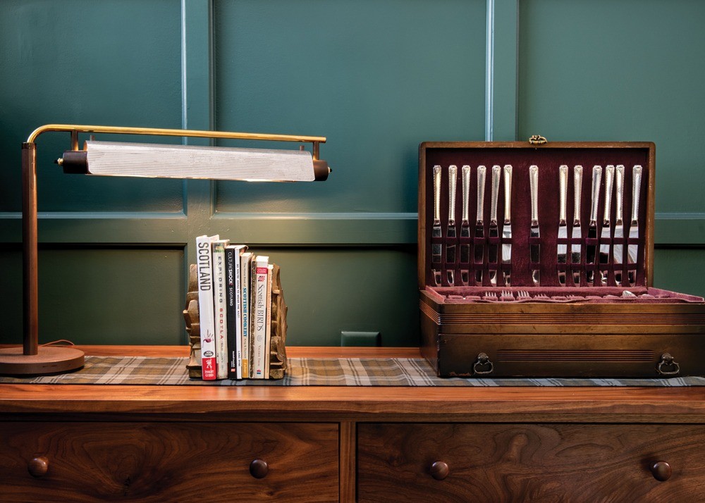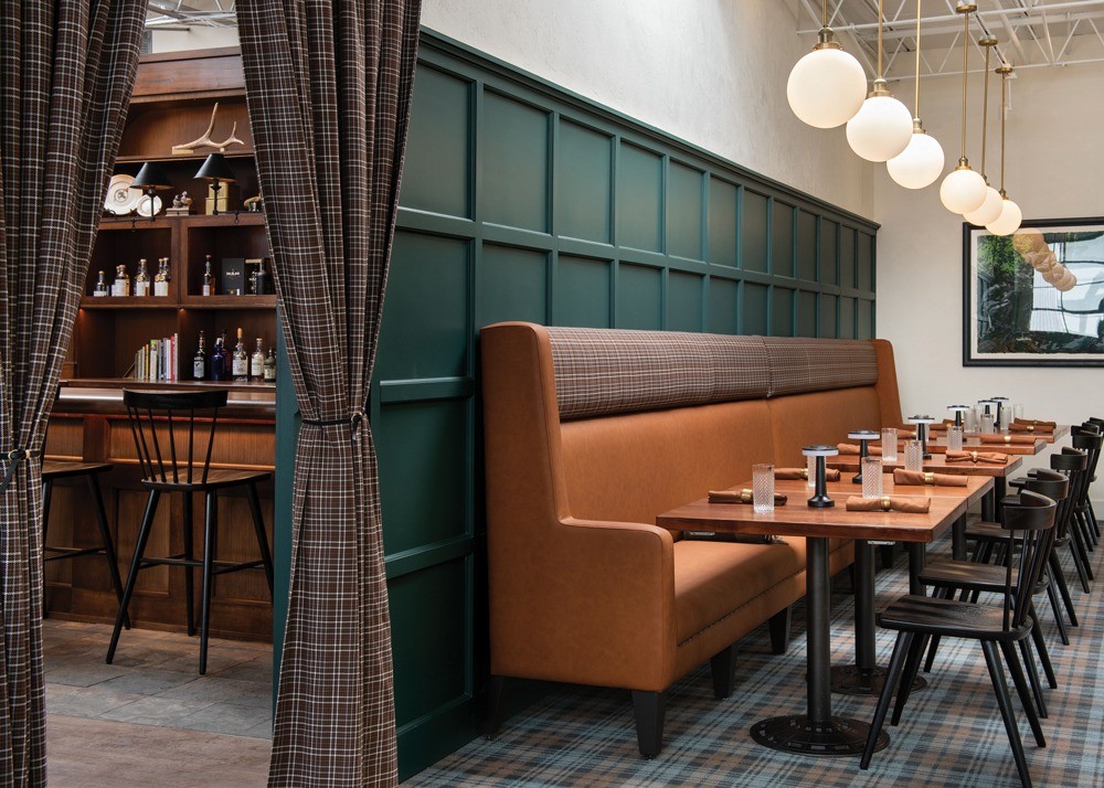 The carpeting in the dining room of this Atlanta restaurant is a Scottish custom-woven design inspired by Gillespie’s great-grandfather’s regimental tartan; the furniture is a combination of contemporary Scottish and handmade classic Shaker-inspired pieces from near Gillespie’s second home.