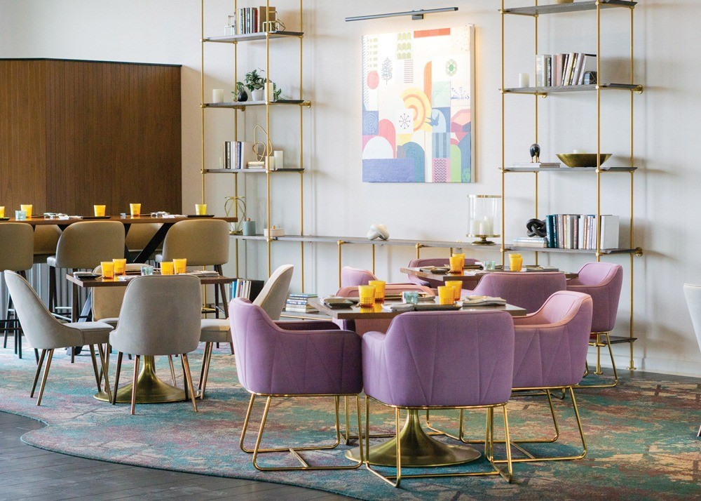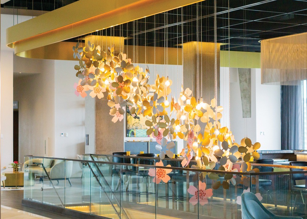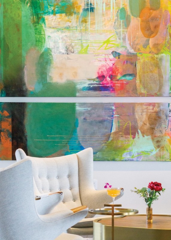 At Wren, Bergman included two amazing chandeliers — one over the front desk that resembles a bunch of floating gold popcorn and another over the staircase featuring small shimmering, hanging gold flowers. “Lighting really catches your eye, and can add to the ambiance immeasurably and be really striking,” he says.