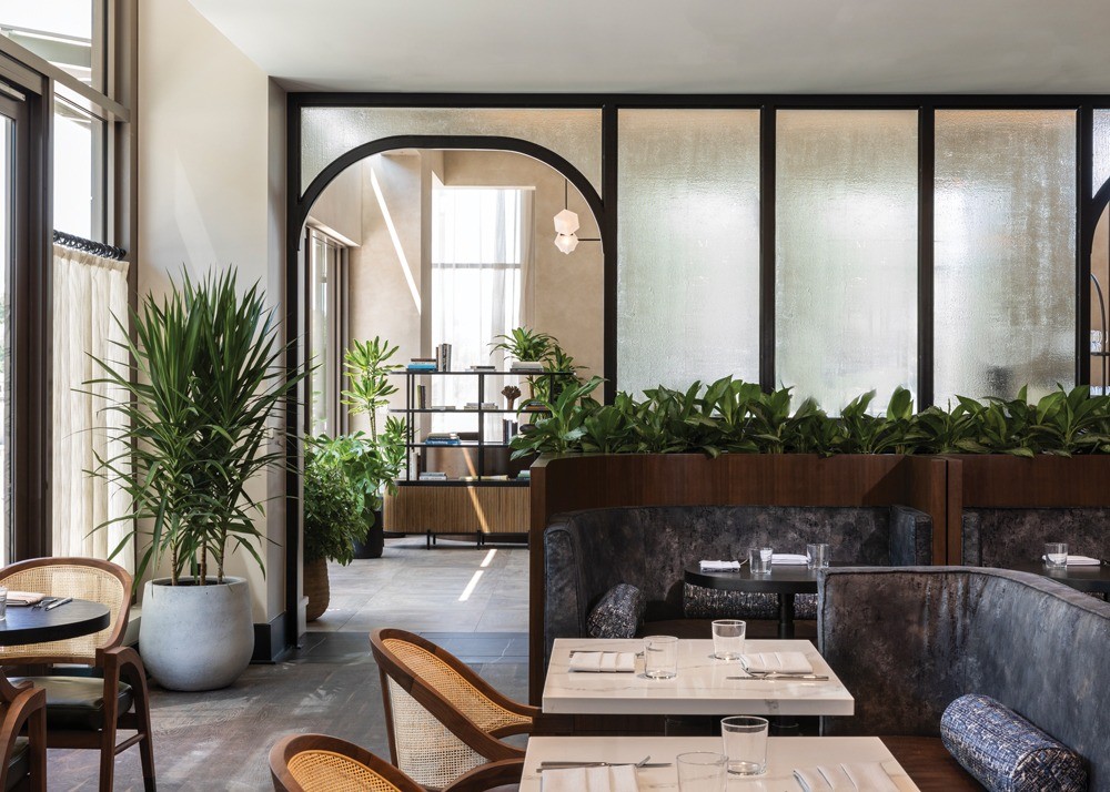 Dividing the narrow restaurant into two halves are open shelving with plant scaping between the banquettes “to give a more layered feel to break the space up, so it’s not just a sea of tables,” Sirna says.