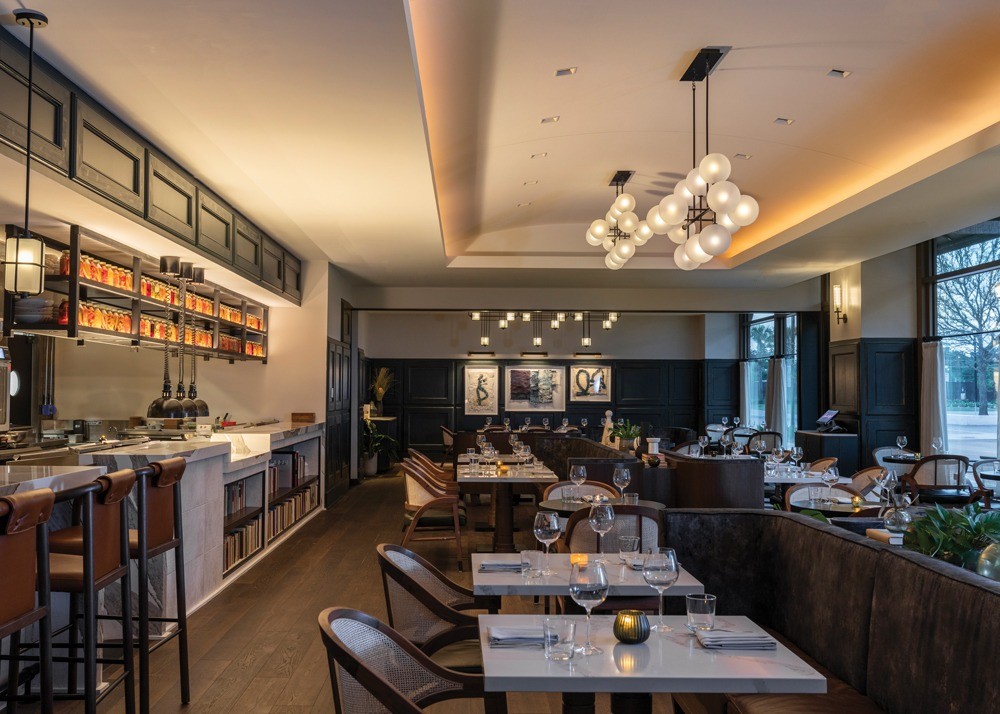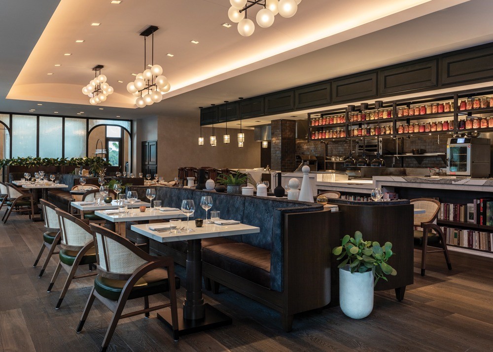 “We blurred the lines between the two spaces. Since the restaurant is open to the main lobby, we continued some of the same colors and tones used in the lobby but kept a darker seating palette that juxtaposed against light stone tables. This allows the colorful culinary creations to be the artwork for the space.”