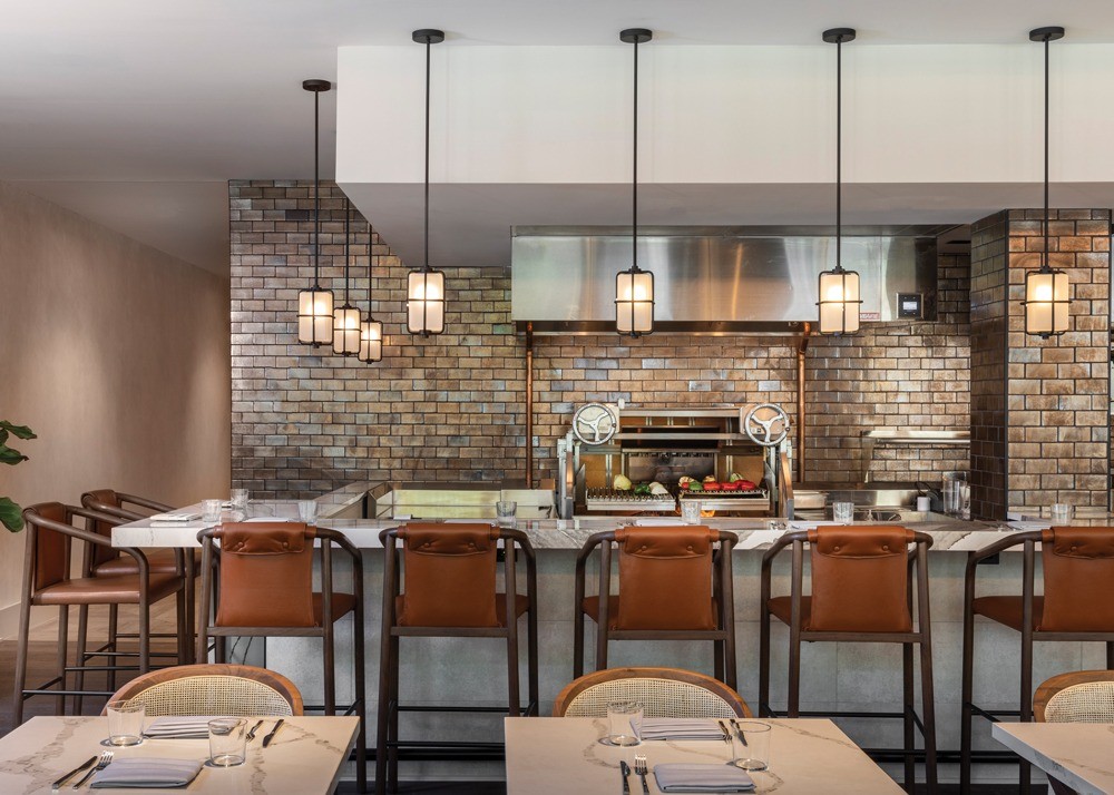Running the length of the restaurant is an open kitchen and eating bar. The latter features leather stools facing a wood-fired oven. The space was designed around this oven, and handmade brick tile on the back wall is treated for cooking and fire safety. “It was an important design element to have an elevated backsplash that emulated the feel of the night sky and glows bouncing off the coastal waters of Savannah,” says Sirna.