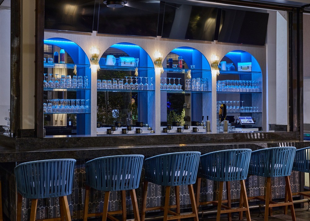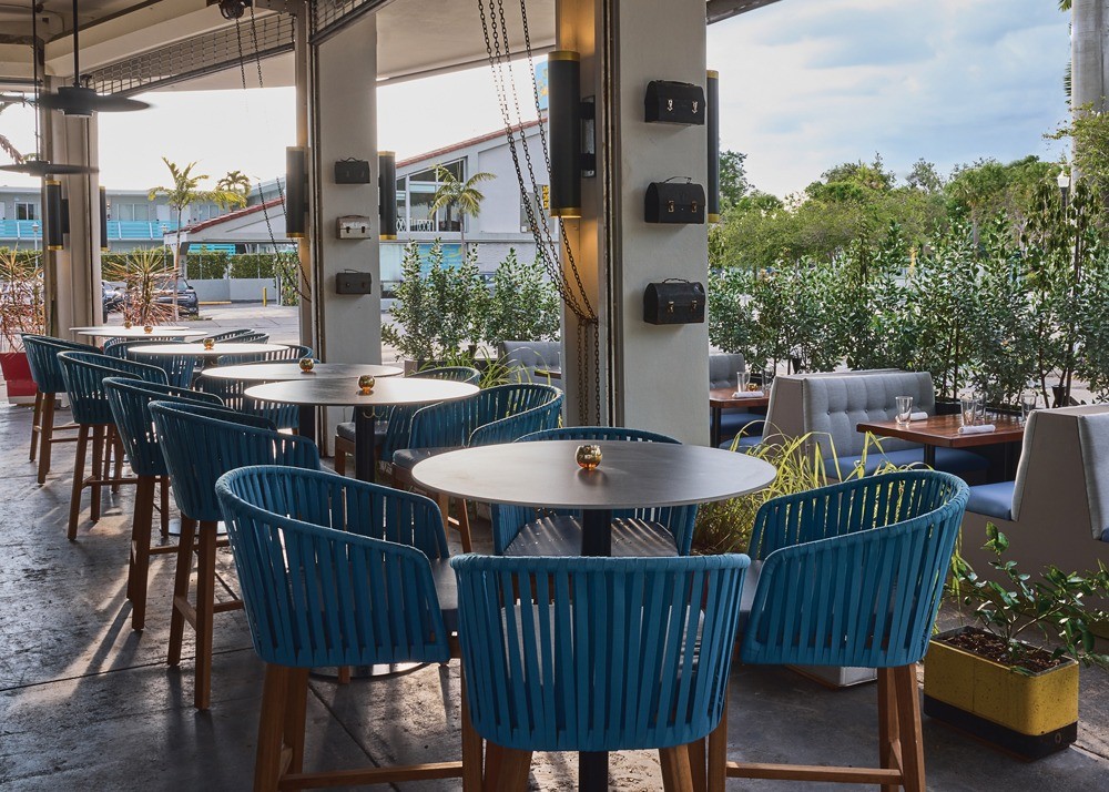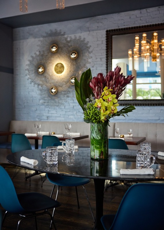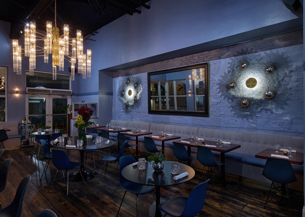 Recently reopened after a renovation, Blue Collar is chef/owner Danny Serfer’s love letter to mid-century modern design. With the help of Samantha McKenna of Chelsea Design and Joey Halpern of Joseph Halpern Woodworking, Serfer designed the new space himself and sourced much of the decor from thrift shops. Serfer scoured thrift stores for a vintage credenza and a gold-framed mirror with matching metal pinwheel light fixtures. Outside on the patio, Serfer placed a smattering of vintage ice chests and coolers in place of planters.