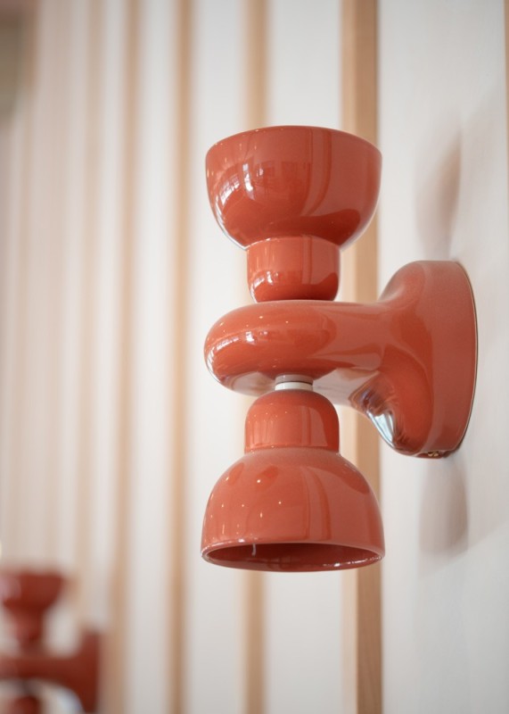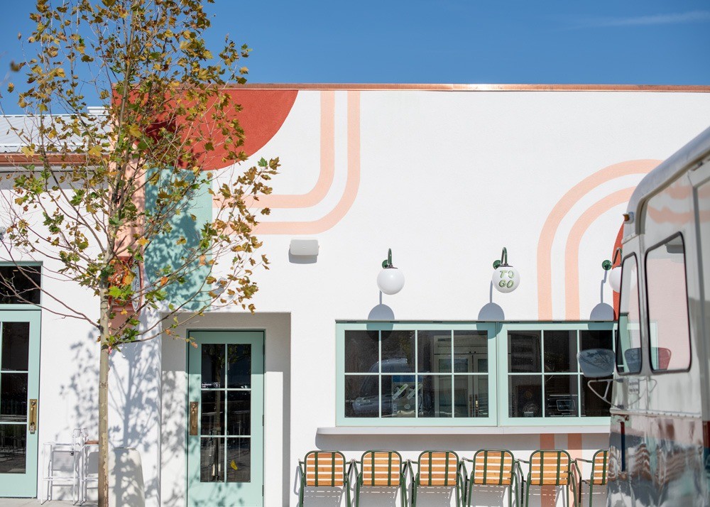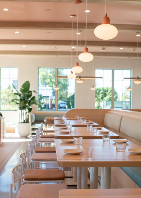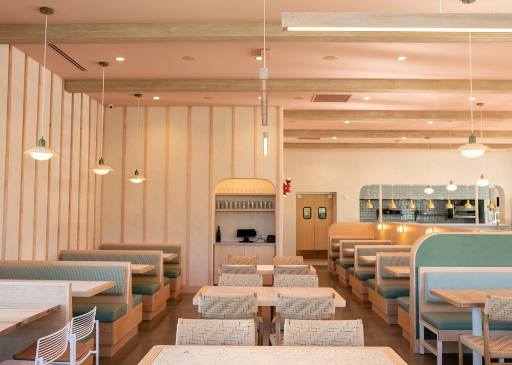 The interior features muted shades of beige, pink and turquoise reminiscent of New Buffalo’s sandy shores and pops of terracotta can be seen in the mid-century and Danish-inspired lighting.