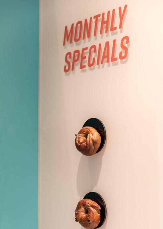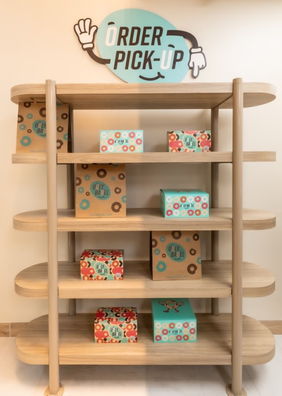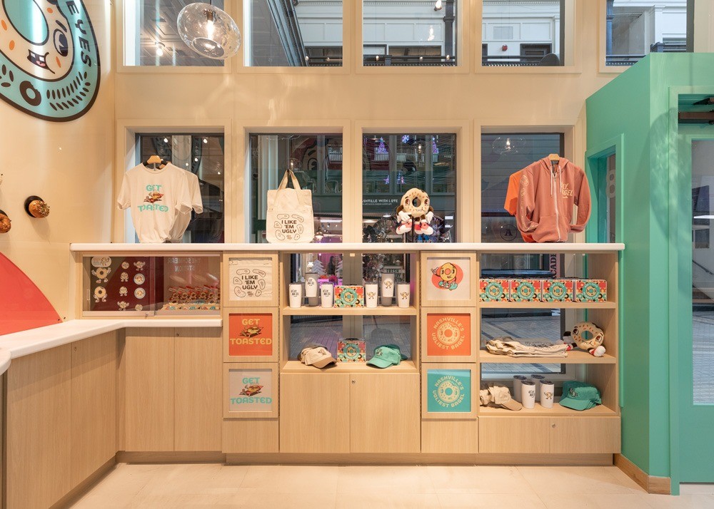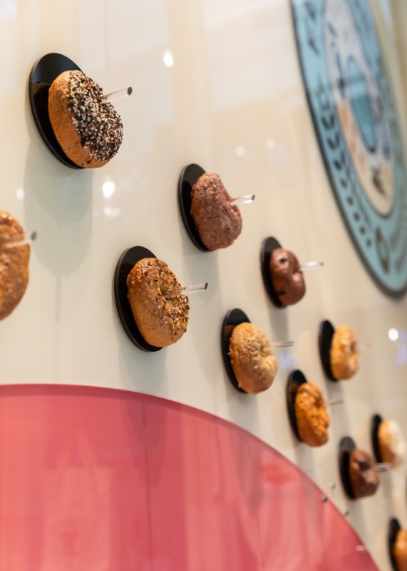 After placing an order at self-checkout kiosks, guests are invited to watch the bagel-making action through a rolling window. As you turn to leave, a merch section highlights t-shirts with cheeky phrases like “get toasted,” and tote bags that read, “I like ‘em ugly.”