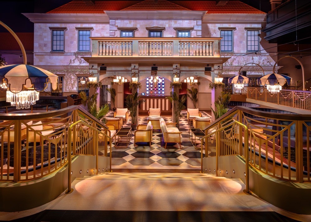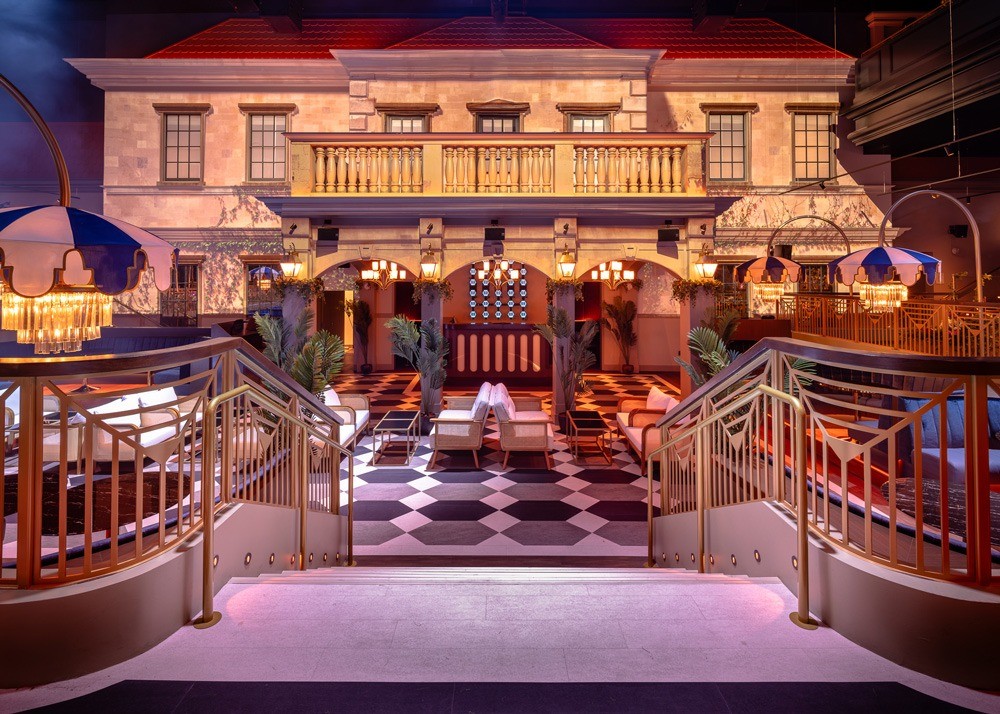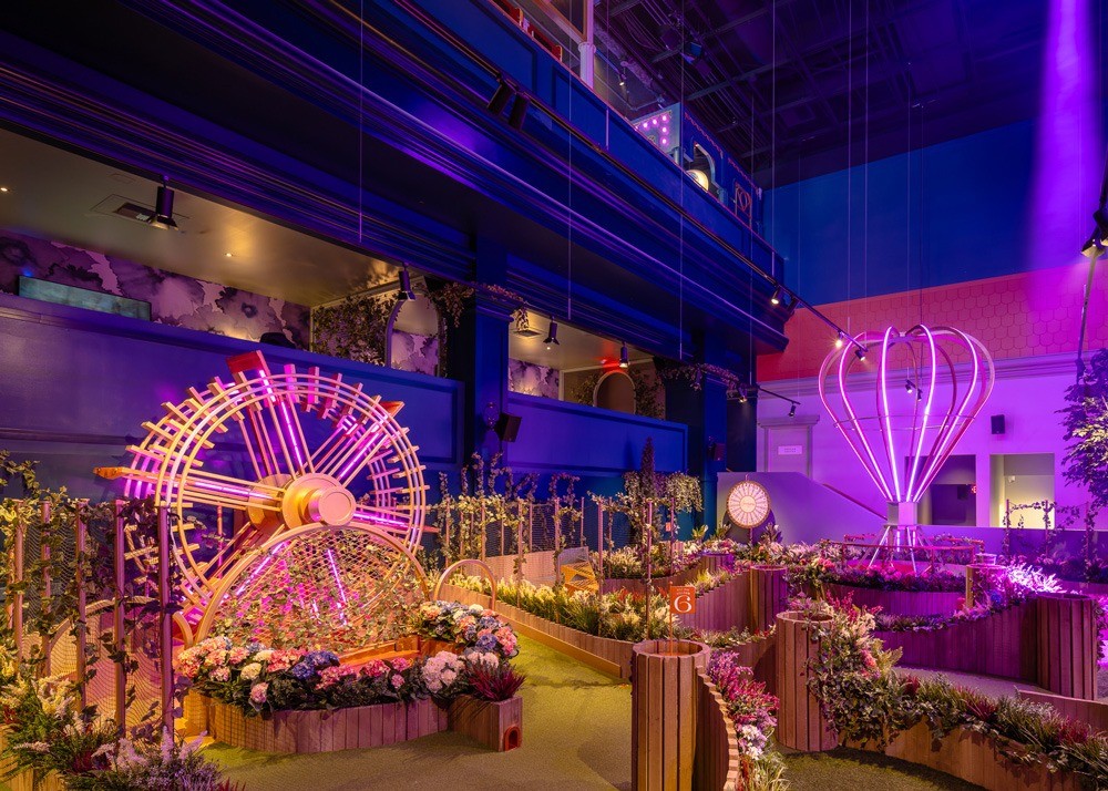 The design centers around a two-story English country house. An animated projection changes from day to night and with the seasons. The house transports guests to the bucolic English countryside and sets an unexpected scene for the DJ booth, which sits in front of it. Guests can choose from multiple themed bars throughout the venue, including the Estate Bar, which spans the length of the space; a split-level lounge called the Clubhouse Bar; and the Sunken Garden features a parasol-covered DJ booth located at the front entry of the English Country House. Included are whimsical touches like faux greenery, a neon hot air balloon, and chandeliers designed to look like parasols.