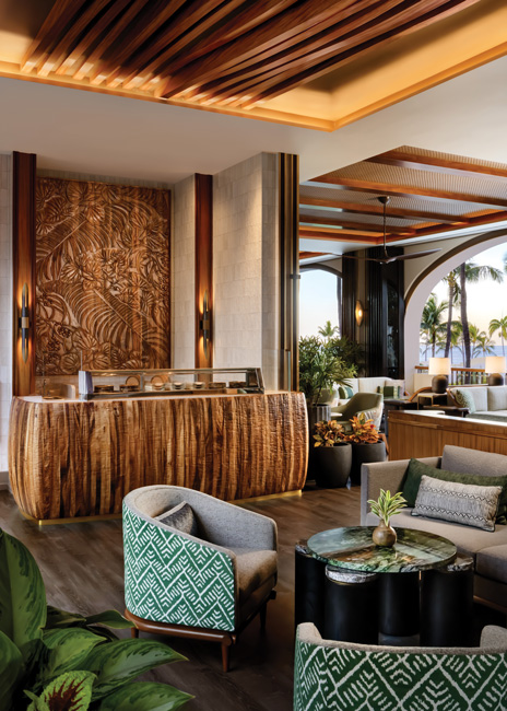 At the Fairmont Kea Lani hotel in Maui, Hawaii, Parker-Torres’ senior designer Regan McLean worked with a local cultural advisor and incorporated a hand-carved piece as the back bar, integrating it completely. She used monkeypod wood throughout to connect the separate parts of the restaurant, with the wood from the entrance stretching across the ceiling to the bar. “All of the elements are heavily integrated,” says Blair. “It’s really important that it feels like something special; it’s that extra level of detail.”