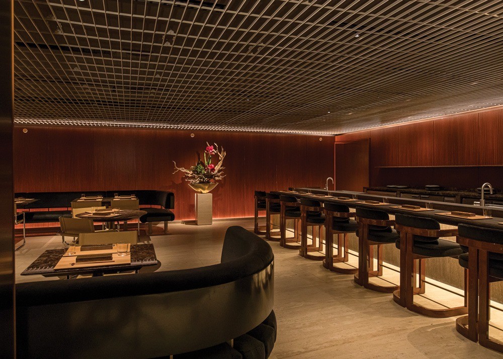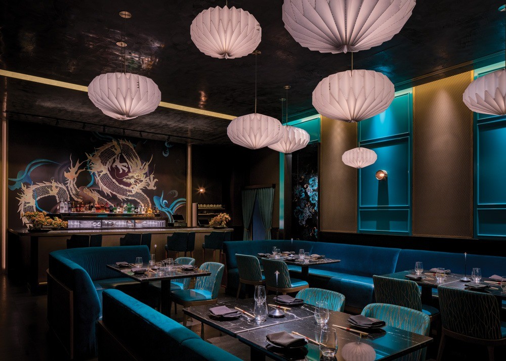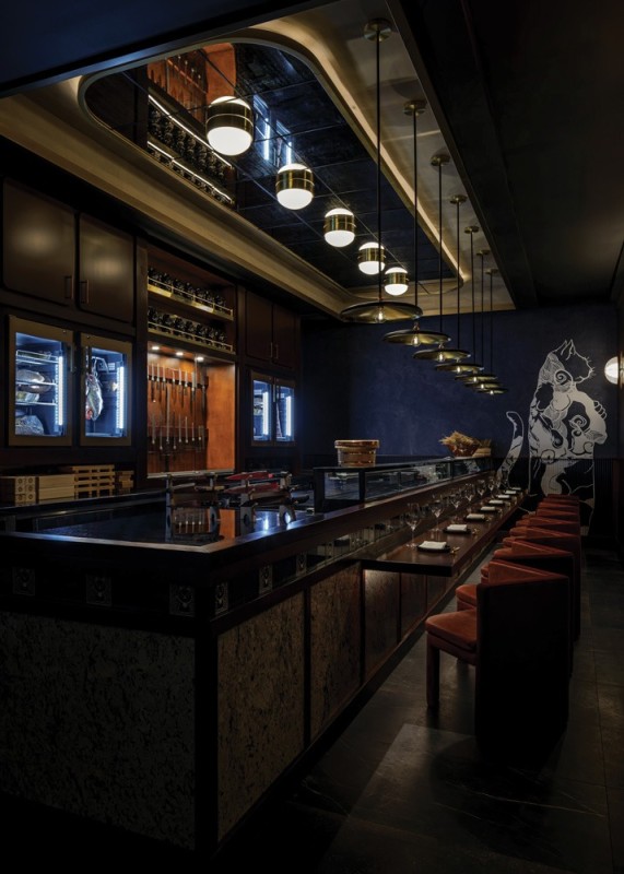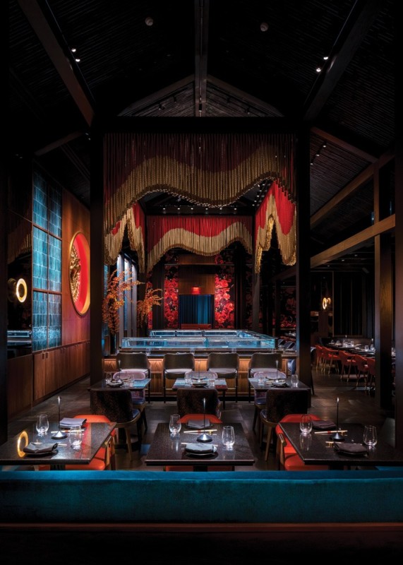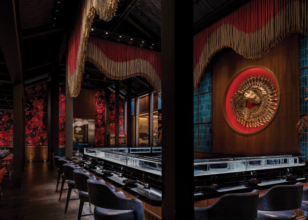 In the center is an island sushi bar, which was an unusual move, says Sullivan. “We took a risk and put it in the middle of the dining room [so] the whole dining room gets to see that theater,” he says. Drawing additional attention to the sushi bar are red and gold ropes hanging above it and a gold wall sculpture of a dragon with an Ouroboros design. These, says, Sullivan, “celebrate” the sushi bar and add dramatic flair.