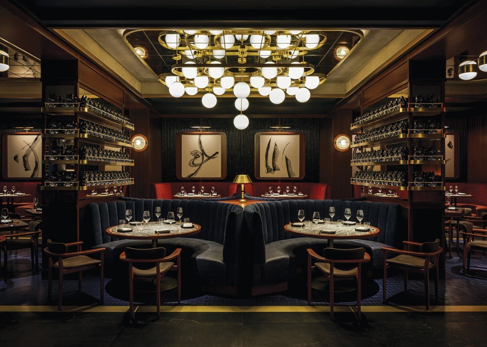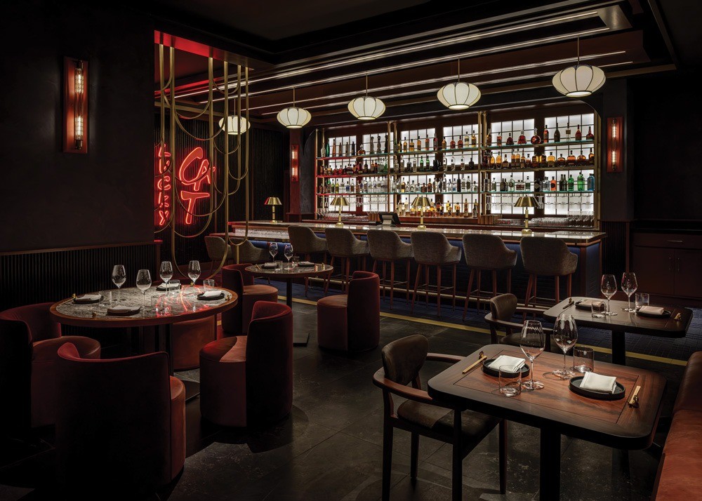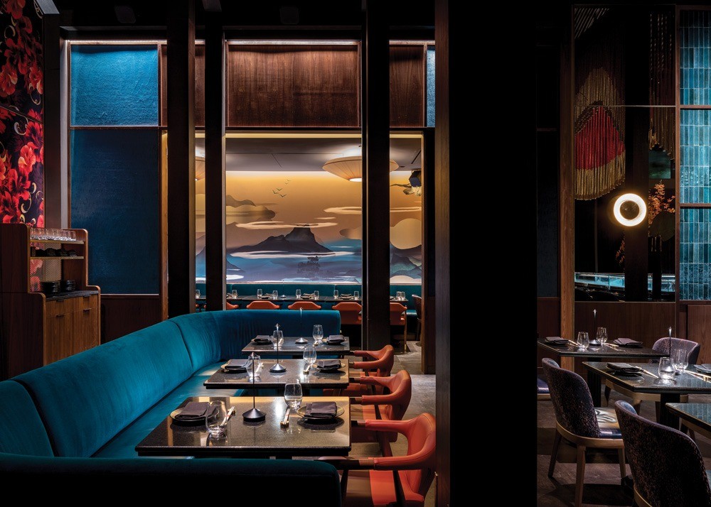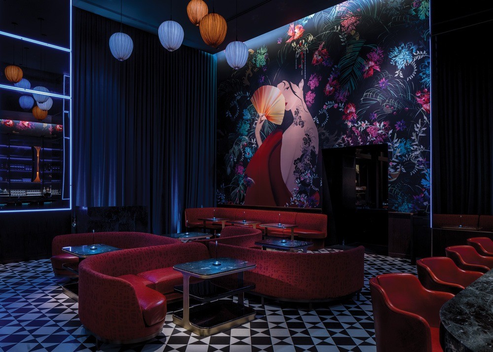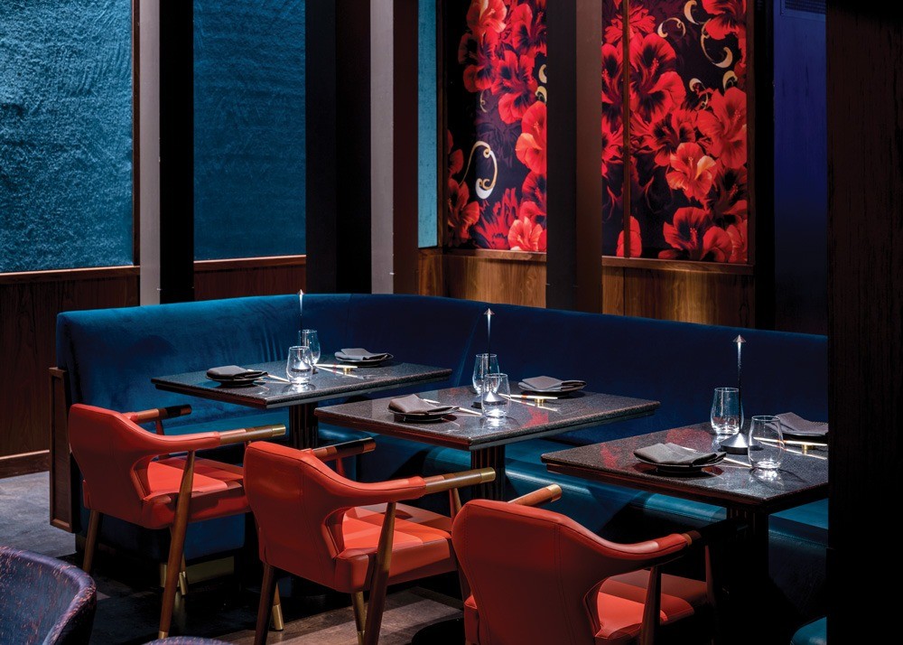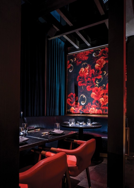 The 102-seat dining room is designed with dark, moody hues and splashes of different shades of red, including dramatic red floral murals.