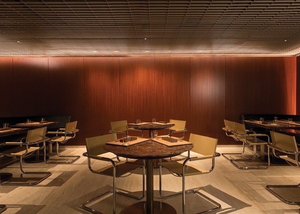 The private dining room has similar pinks, browns and muted earth tones and the classic travertine floor that runs throughout. The door is reeded glass, giving glimpses into the restaurant. And it’s clad differently, Garnett says. “We imagined it having a pinkish glow from 50 feet away.” The private dining room features walls of silk linen upholstered panels, which absorb sound so the space is more muted than the larger restaurant.