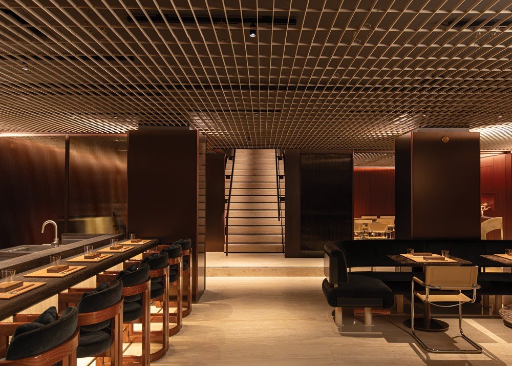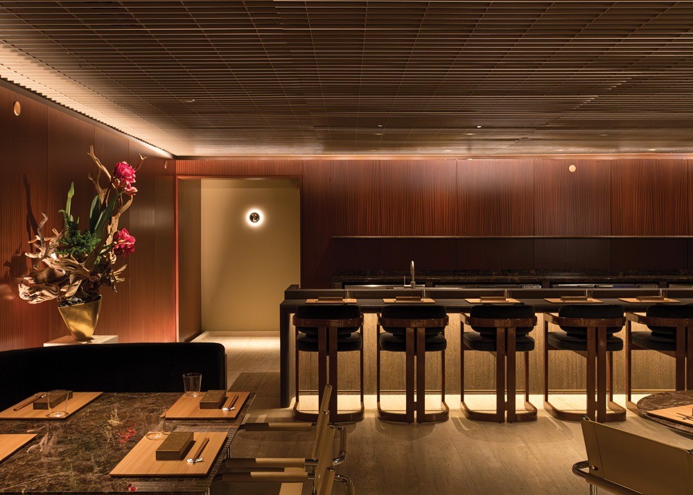 Neuffer included some Art Deco touches in the lighting, reminiscent of 1940s Tokyo. There are also lantern-inspired decorative globes, and some strip lighting to highlight finishes in the ceiling elements. “We did a good job of making sure we had enough decorative lighting along with architectural lighting,” she says.