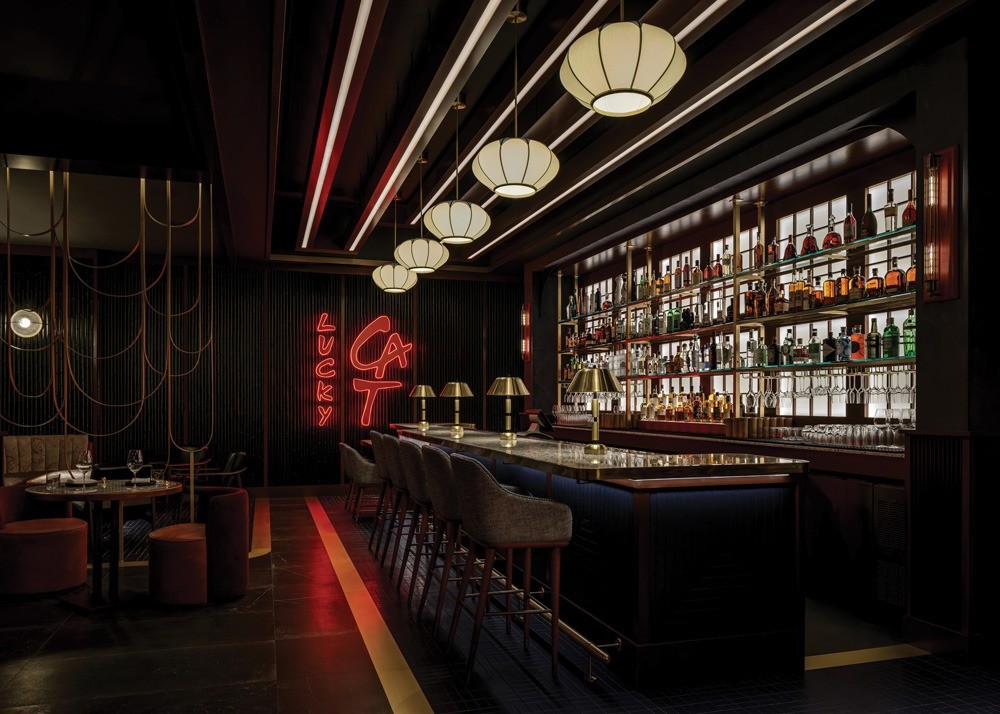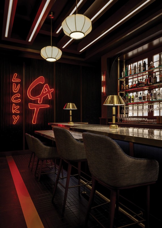 It was really important that there be no kitschy feel to Lucky Cat, “so it came down to using those elements wisely and being very specific in where we want them to appear,” Neuffer says. “Our approach was about bringing in that nightclub feel and honoring the Japanese traditions and the food — bringing in little cheeky elements and being intentional with it.”