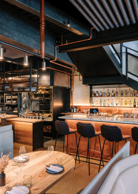 As for the bar, it’s petite. “It’s very intimate — probably the smallest bar we’ve designed,” Kaplan says. “But it had to be small to accommodate the open kitchen. The bar now sits literally underneath the staircase, and it’s a boutique, beautiful little gem with just four or five seats. We needed the kitchen to be a sort of stage, because part of the goal was to create this warm glow and have people actually be able to see and smell the food being cooked. It’s a really important part of the experience.”