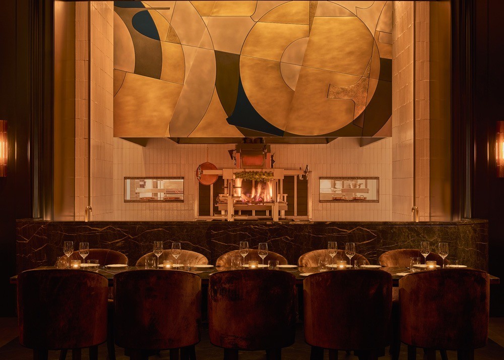 With 18-foot ceilings, the soaring dining area seats 120 and features plush banquettes, a curved bronze quartzite-topped bar and leather- and wood-clad walls. The parquet wood flooring, stone and tile were imported from Italy. Custom light fixtures and custom furniture were fabricated internationally. A focal point of the space is a custom metal artwork that hovers above the wood-burning grill.
