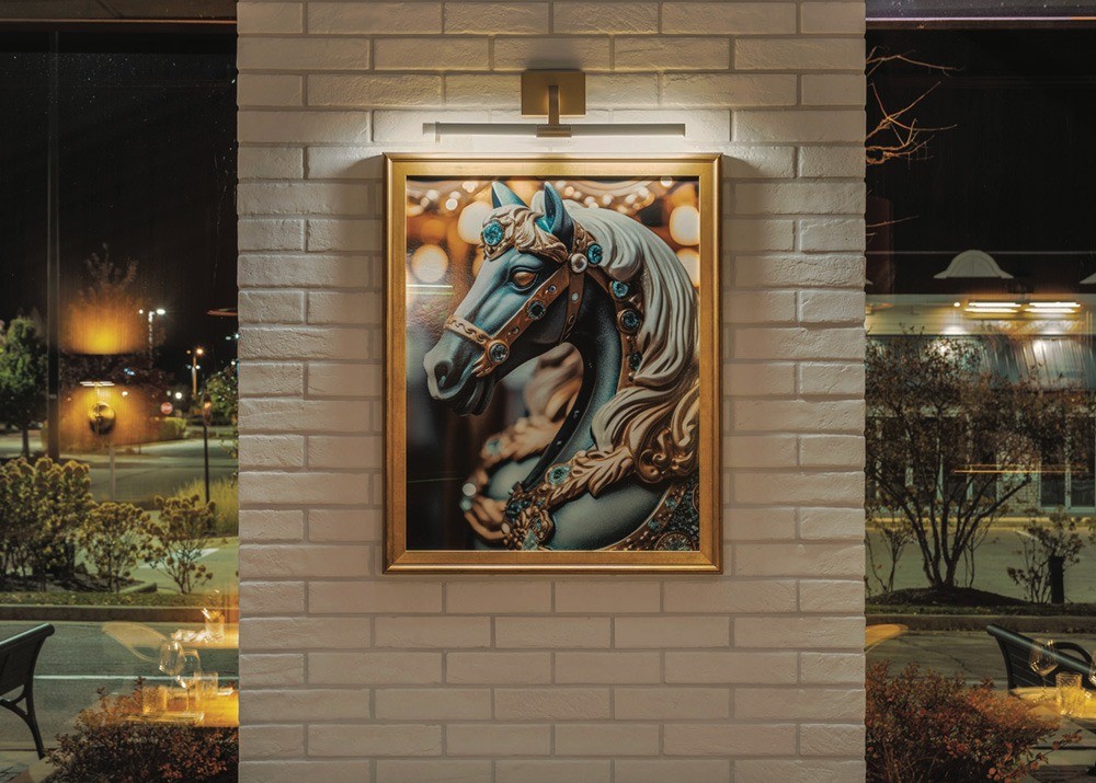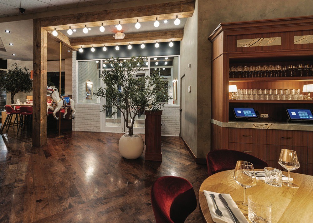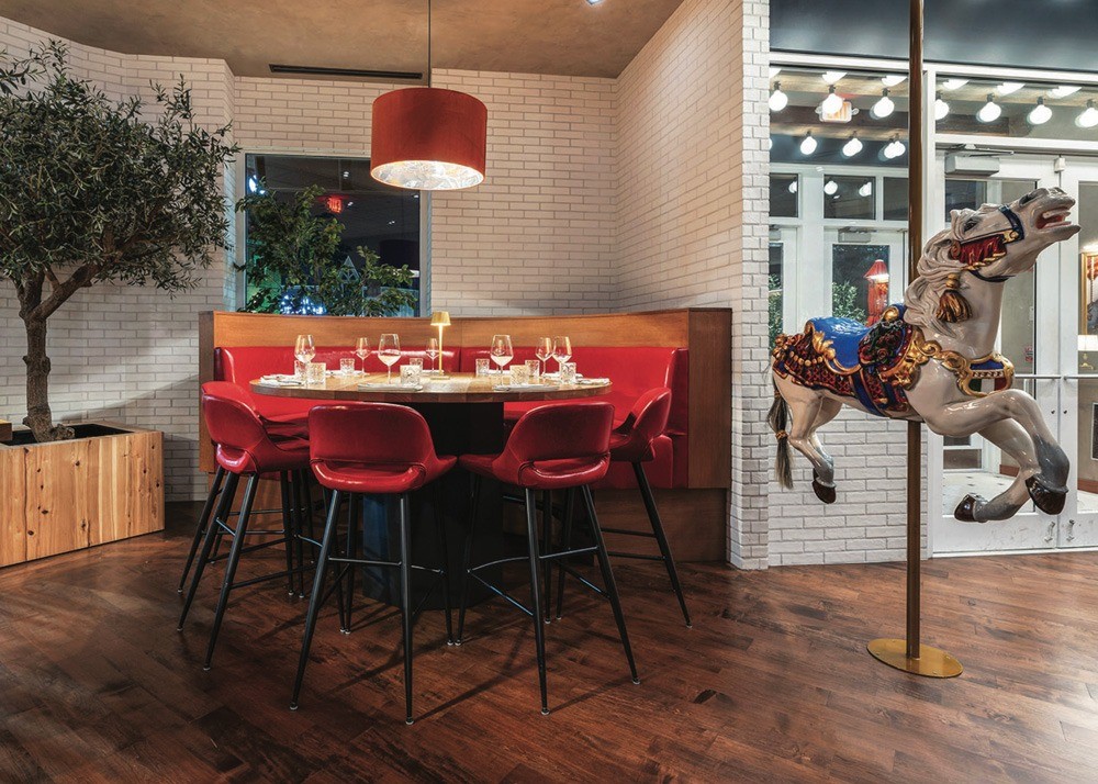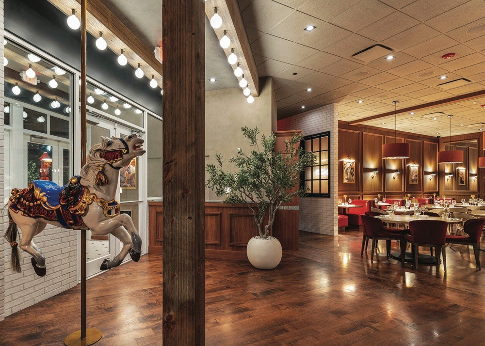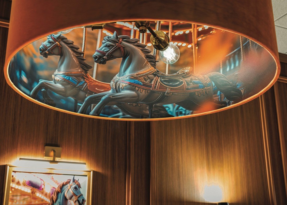 The design aims for thoughtful and refined immersion. The entryway features rows of lighting that are reminscent of being on a carousel. A restored antique carousel horse sits as the focal piece of the entryway, adding whimsy and nostalgia.