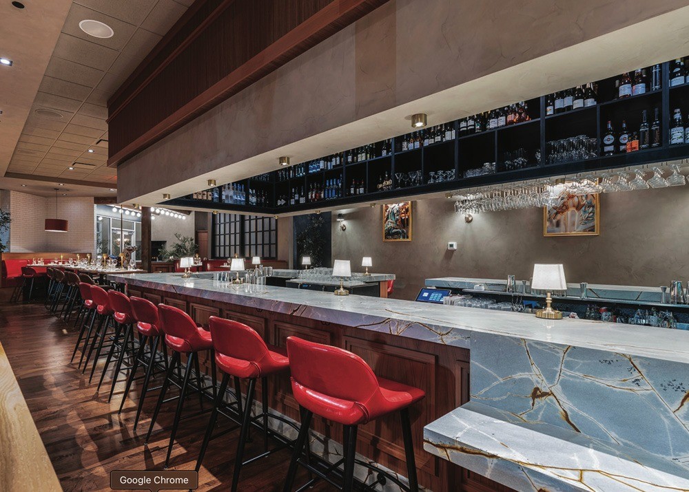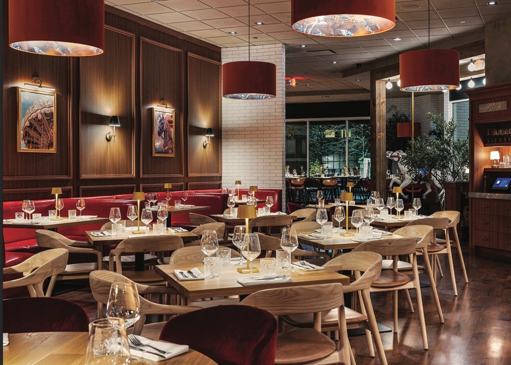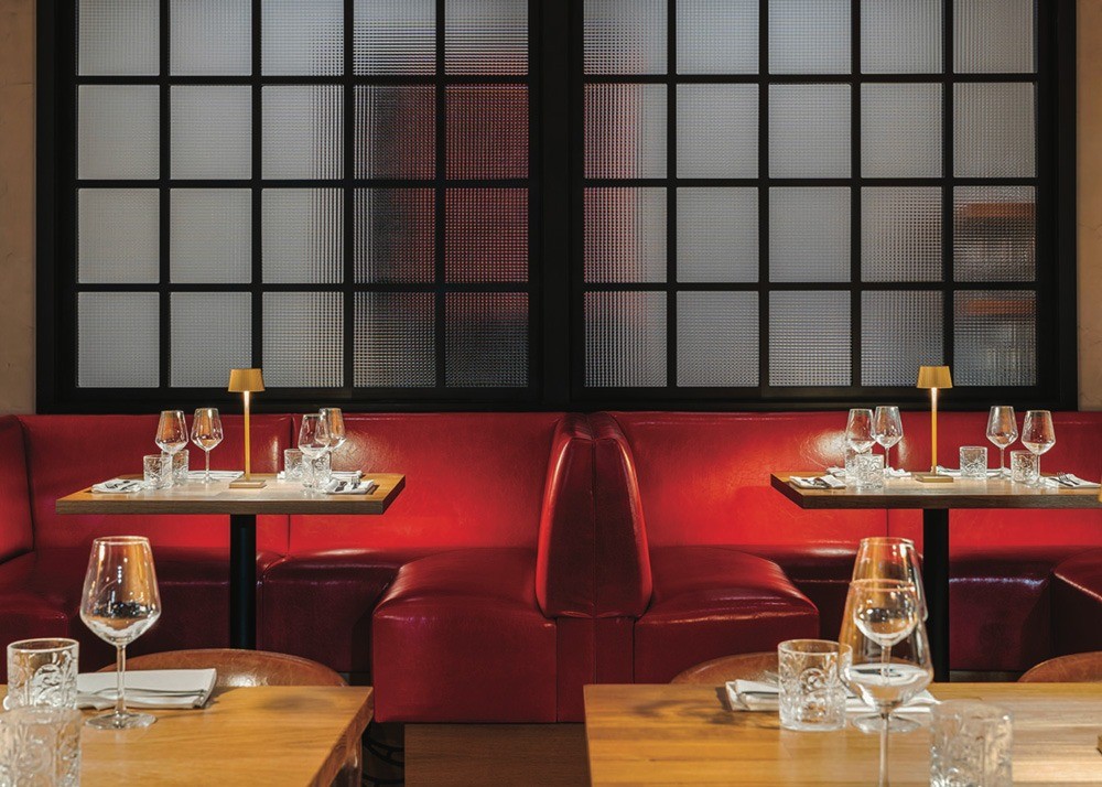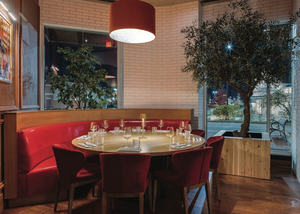 The bar features bright red booths that pay homage to classic Italian eateries and sleek bar stools with clean silhouettes to keep things modern. Greenery adds a touch of nature, creating a welcoming and balanced environment.