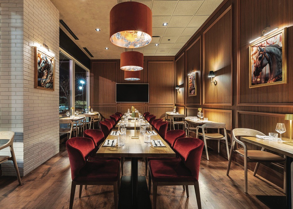 The main dining rooms are clad in floor-to-ceiling wallpaper designed to look like traditional wood moldings. A curated collection of vintage carousel images line the walls,