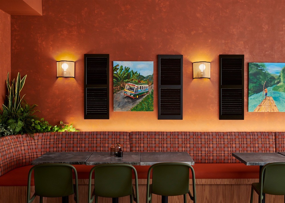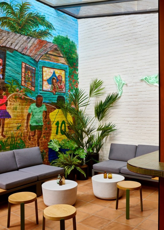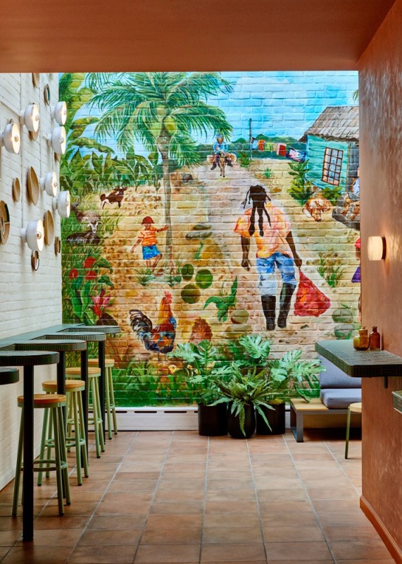 Each of these spaces are designed to be a visually distinct element in a cohesive design story. For instance, Studio For designed and fabricated a custom wall light fixture utilizing a Dutchie pot, a traditional cooking vessel. While the mural in “The Yard” depicts Chef's childhood in Jamaica.