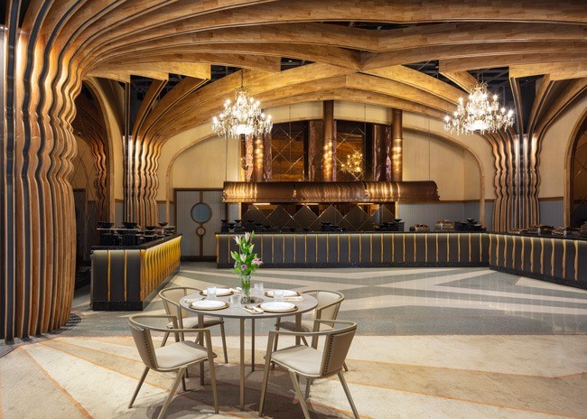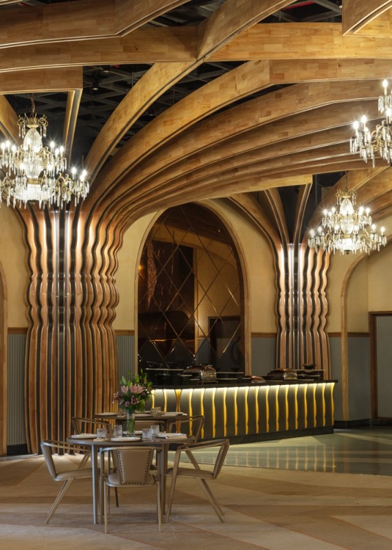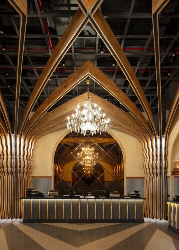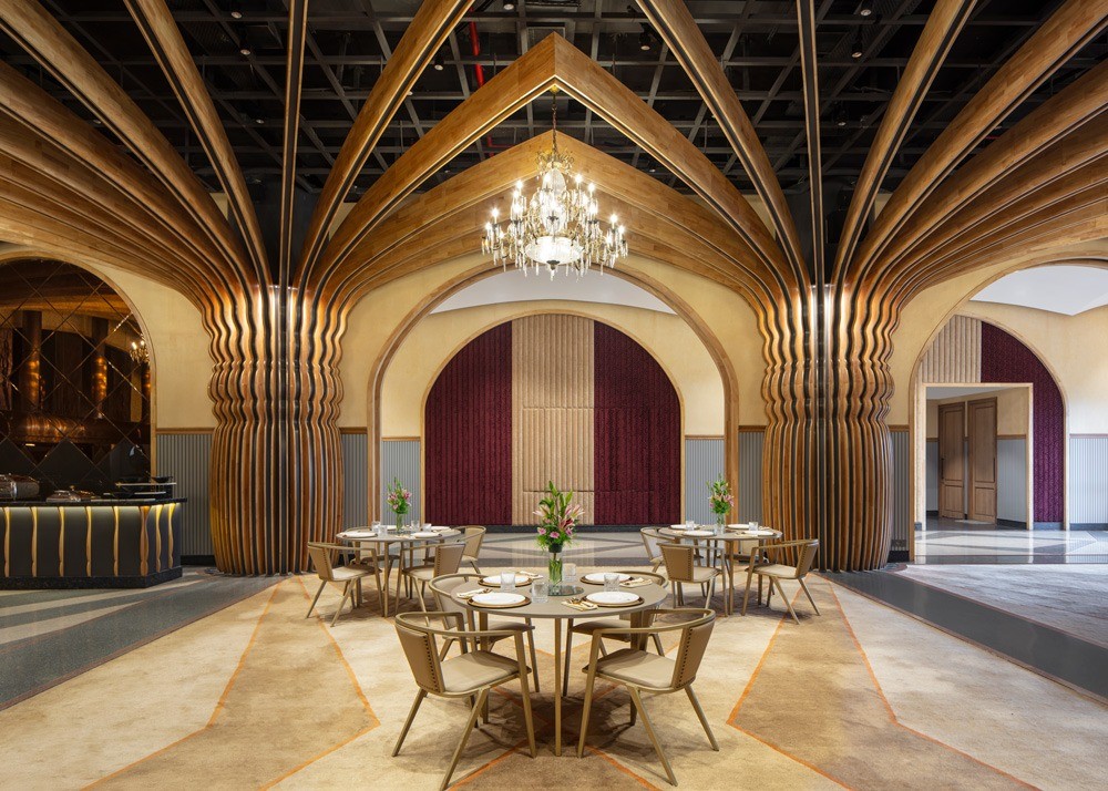 The space was designed for flexibility to accommodate intimate weddings or grand events. Nishtara’s interior features cross-vaulted ceilings and intricately detailed columns that culminate in a dramatic display of spatial storytelling.