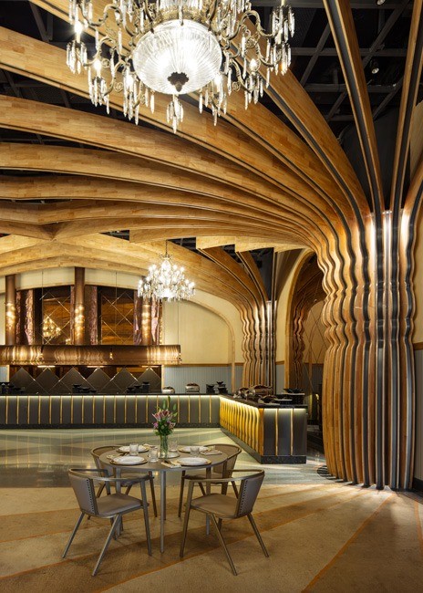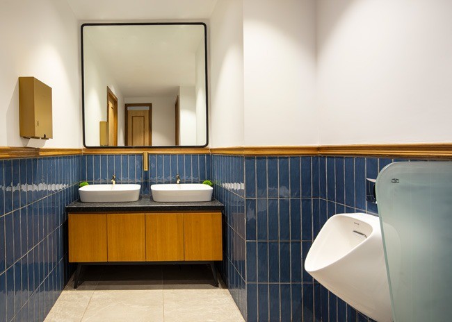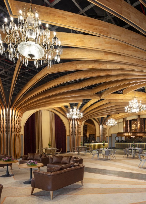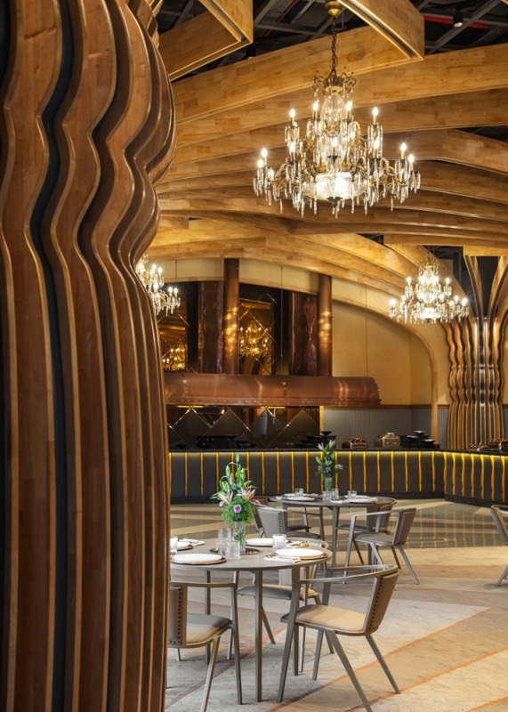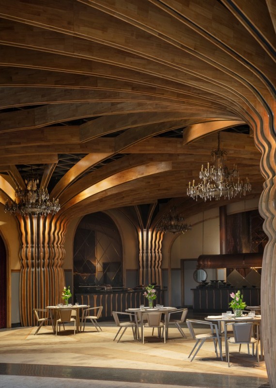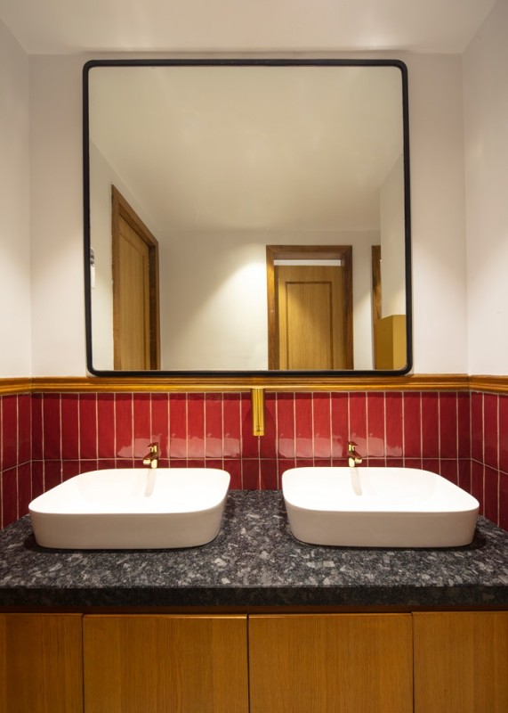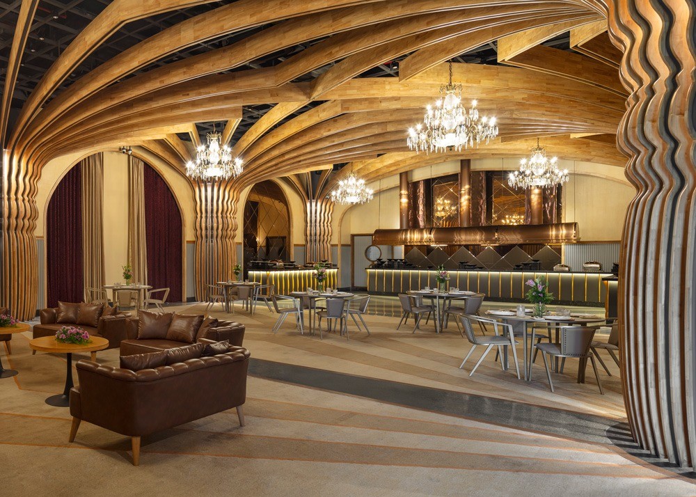 Material selection throughout the project emphasizes texture and warmth. Custom terrazzo flooring, hand-finished chandeliers and a palette of earthy tones contribute to a balanced atmosphere that bridges heritage with modern use.