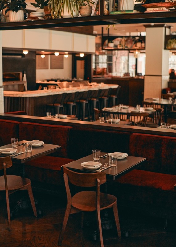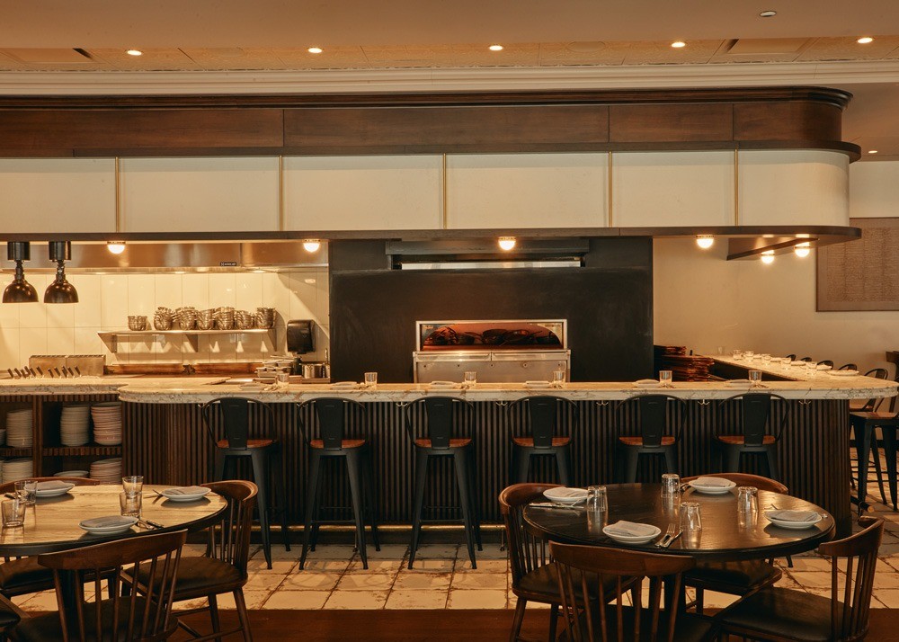 Aria Group worked with Day Off Group to design a restaurant where the food is the star. A large open kitchen runs parallel to the dining room, allowing patrons to observe the kitchen at work. Seating at the Chef’s Counter gives guests a front-row view as pizzas are fired. Pasta and wine are showcased in a dedicated Pasta Lab visible from the dining room.