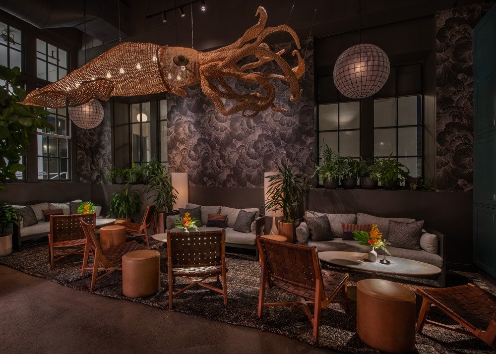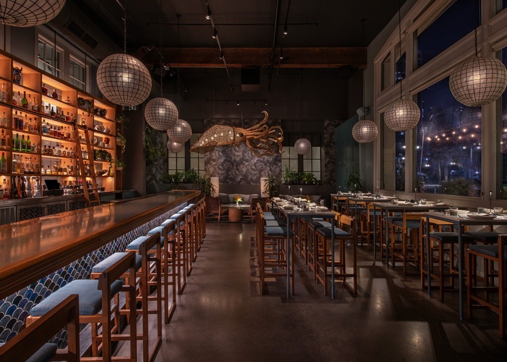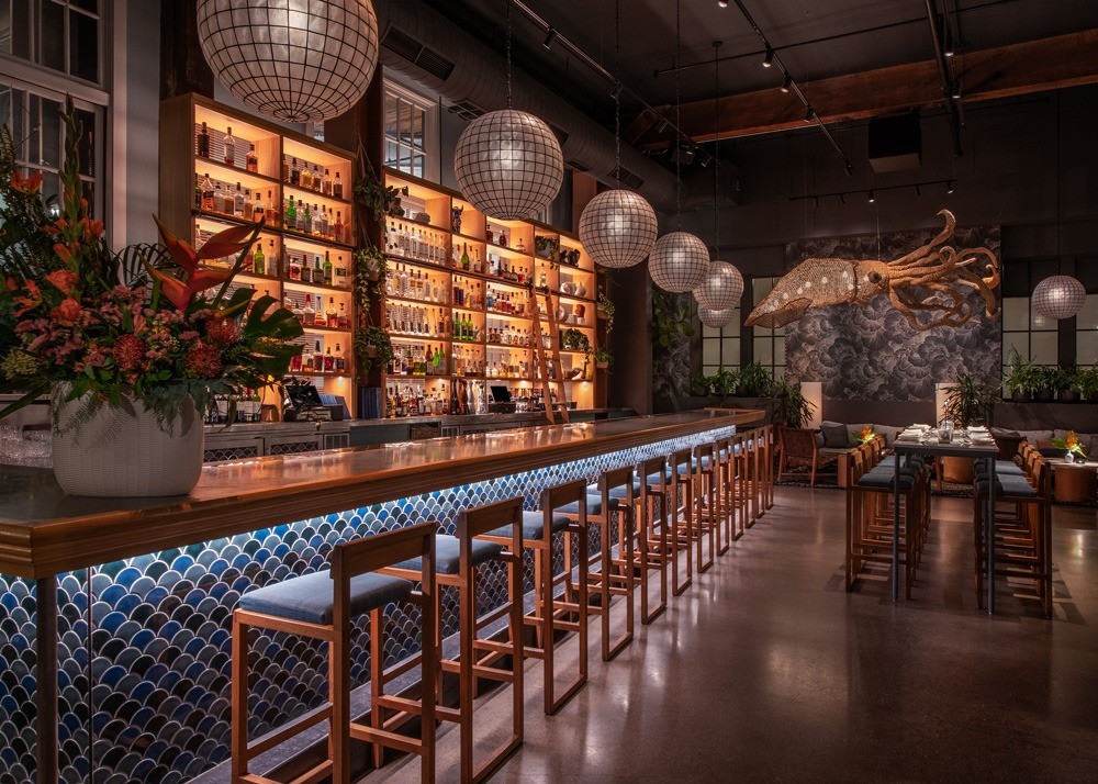 New lighting features include hand-shaped acrylic pendants that mimic the motion of jellyfish, guiding guests through the space. Suspended from the bar’s 18-foot ceiling hangs a 12-foot-long wicker lighting installation in the shape of a squid. According to The San Francisco Standard, the installation was handwoven by Peruvian artist David Goicochea after being specially commissioned by the restaurant and imported from Goicochea’s Lima workshop.
