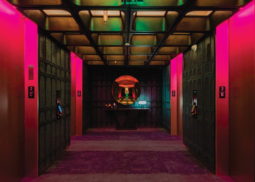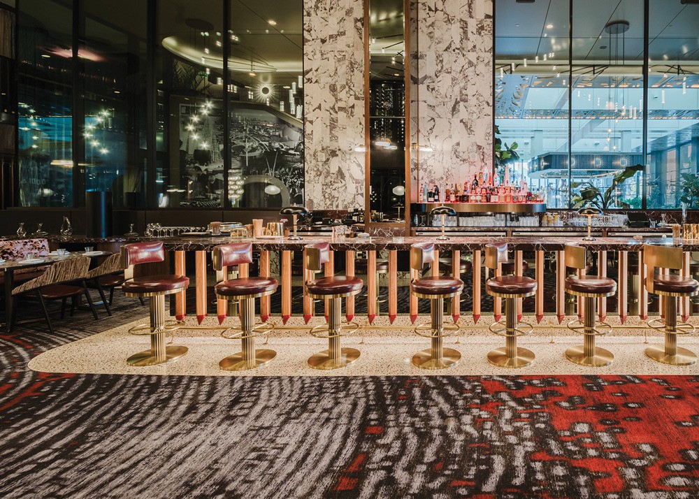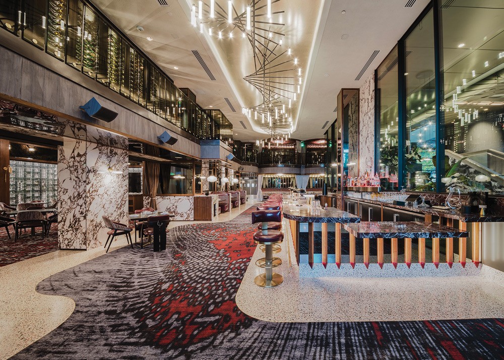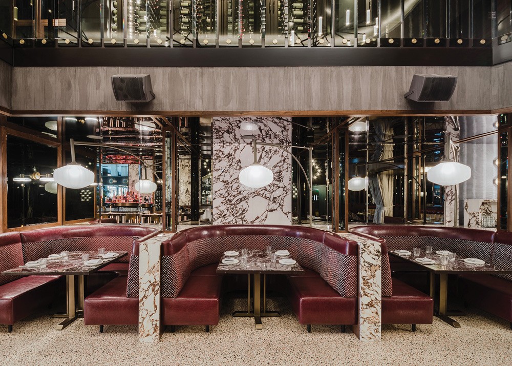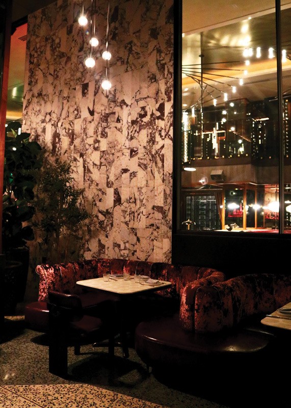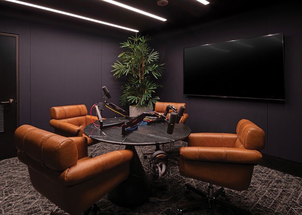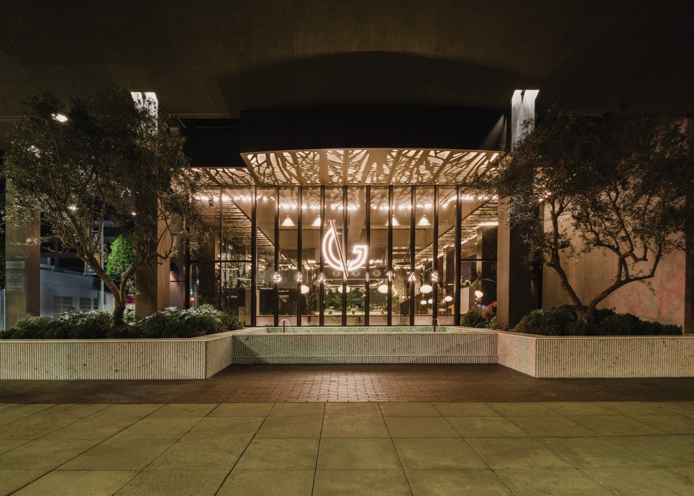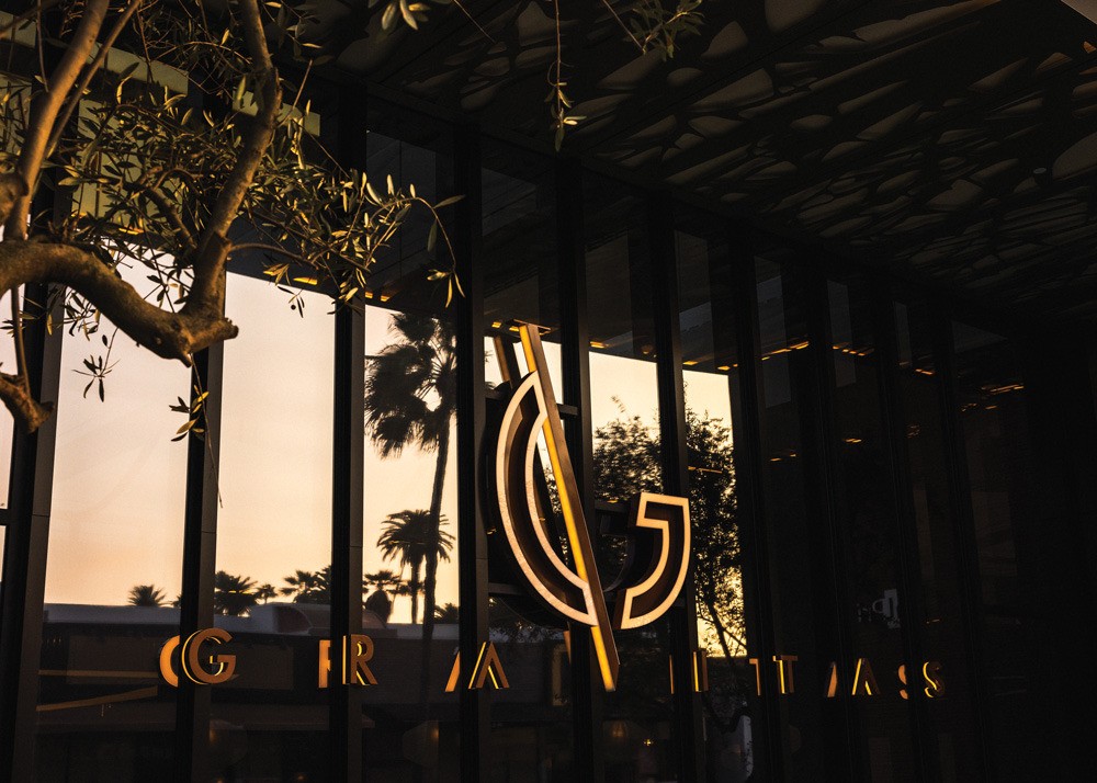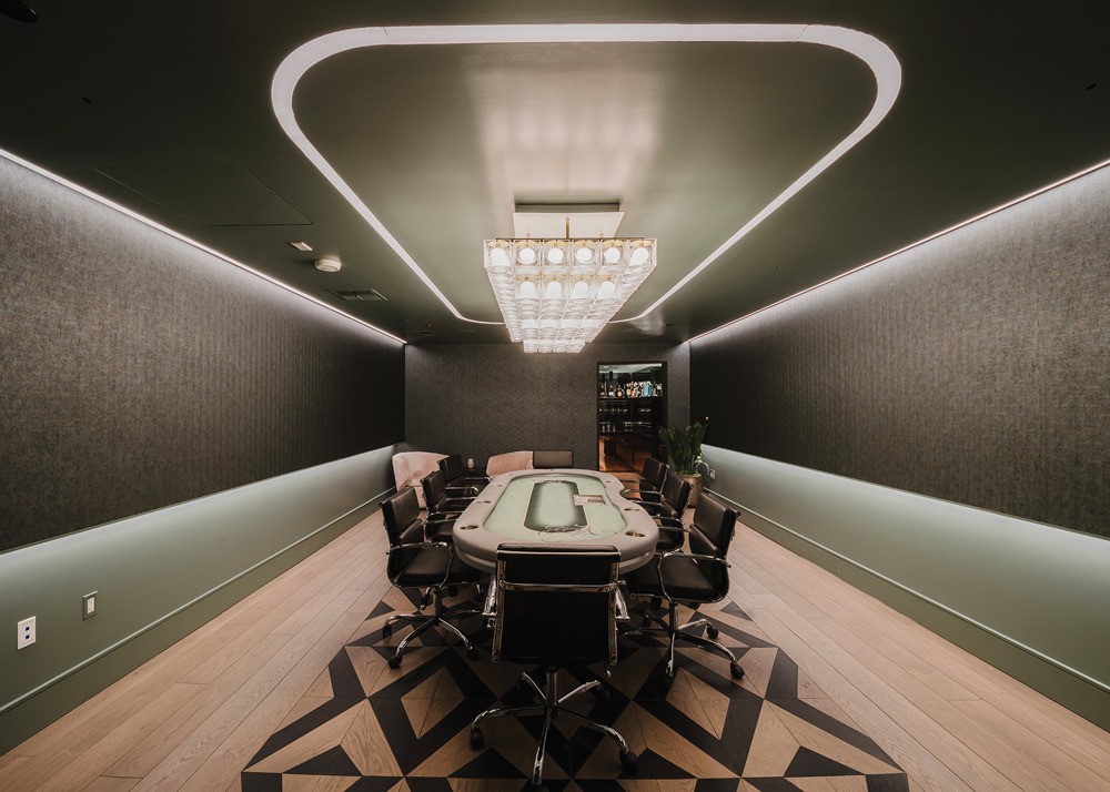 Gravitas is a 28,000-square-foot members-only club that offers open-air dining, private rooms, wine lockers and a recording studio for podcasters and other projects. Designed by Kelly Architects, the space is opulent and highly customized. Three custom murals pay homage to the city of Los Angeles, and many of the amenities reflect the concerns and hobbies of people in the entertainment business.