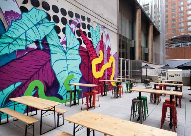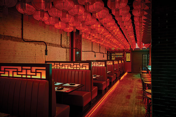 The 9,000-square-foot, 250-seat space could have been cavernous, but Lagula broke it up with low walls, and a decorative server POS station that reaches to the ceiling and contains bottles and plants within one of the restaurant’s signature arches.
