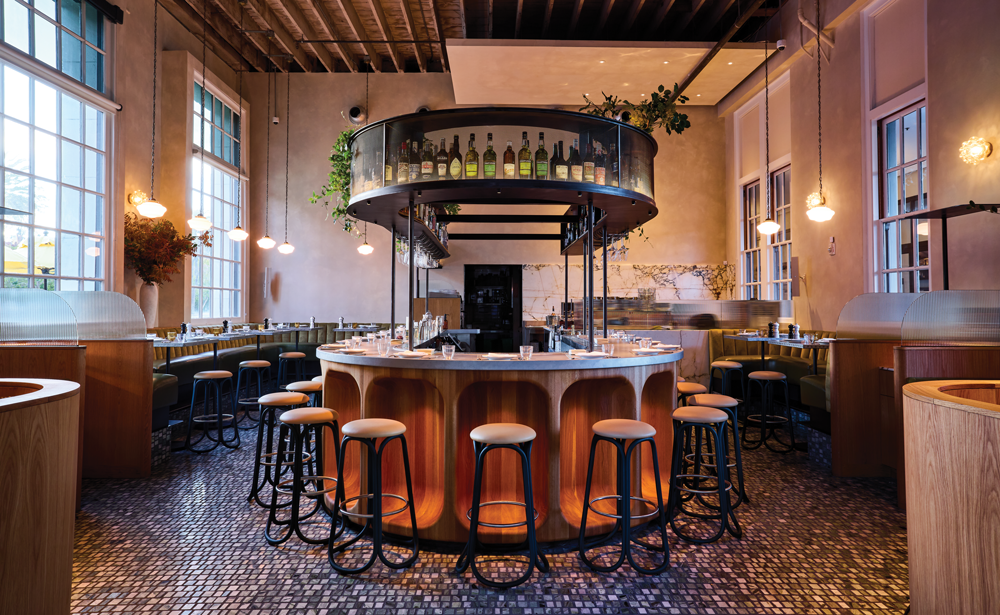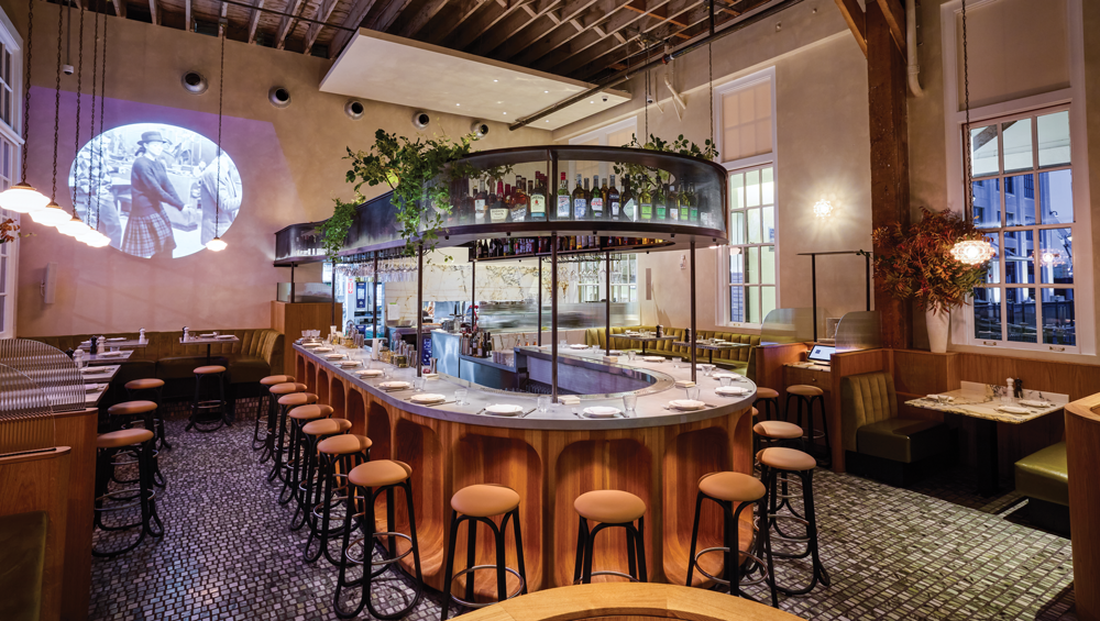 A horseshoe bar anchors Bon Delire, a French bistro that opened in December 2024 near the San Francisco waterfront.