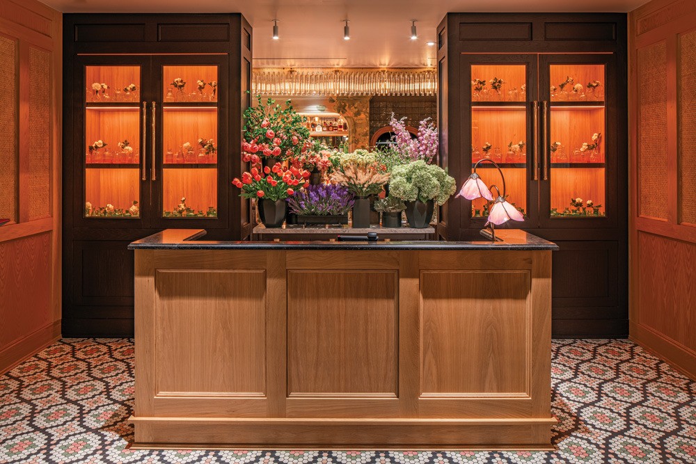 Around the back bar arches Scott commissioned a muralist to paint a French countryside, to provide a “peaceful reference of where the flowers come from,” she says. “We wanted it to feel like a painting that had been there for a long time and deliberately stayed away from Eiffel Tower references.”
