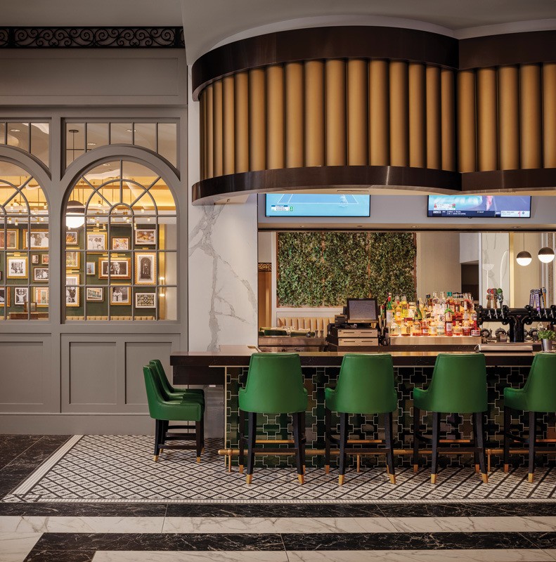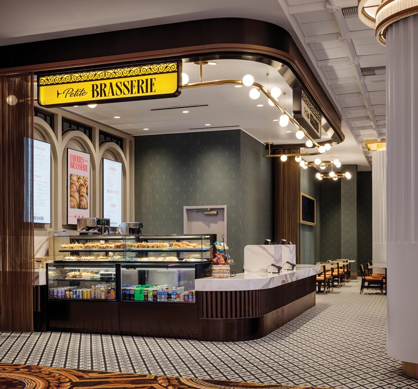 An elaborate gold entrance rotunda welcomes guests from the casino, surrounded by a mosaic floor. “A staple of authentic Parisian cafes, the black and white mosaic tile provided a touch of contrast to the warm palette of greens, brass, and wood,” says JoyceLynn Lagula, associate principal and studio leader, JCJ Architecture, Las Vegas.