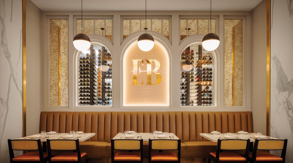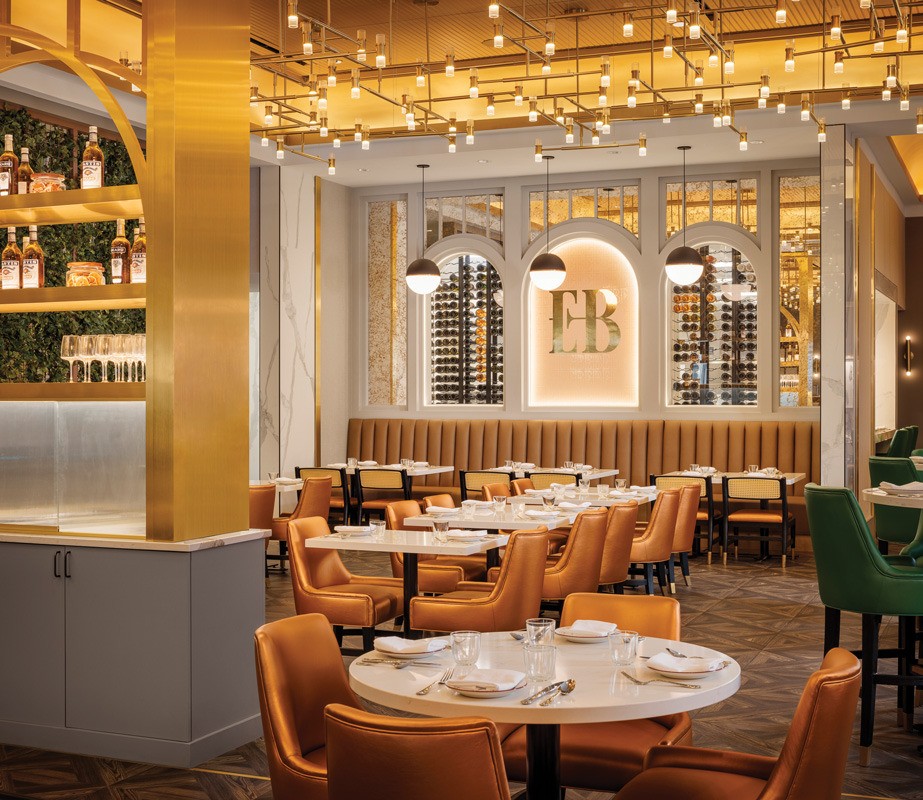 Just outside the kitchen is a feature moment, with temperature-controlled wine storage behind a banquette. The wine storage is featured in two arches, while a third features the EB logo etched onto glass. Guests can see through the wine wall into the kitchen and feel part of that activity. Surrounding the arches is a custom gold wallcovering that, together with three pendant lights provide, “a different intimacy level,” says Lagula.
