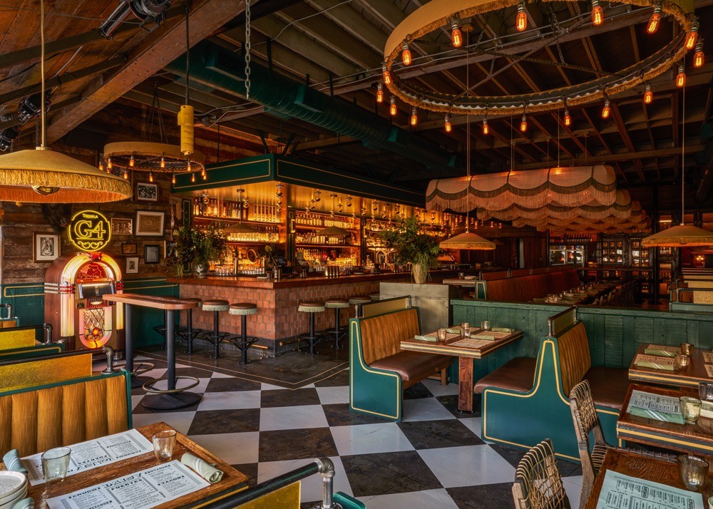 A custom-built jukebox adorned with fringe, leather and wood paneling serves as a focal point, a dive bar influence within the cantina concept.