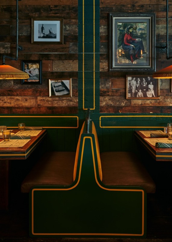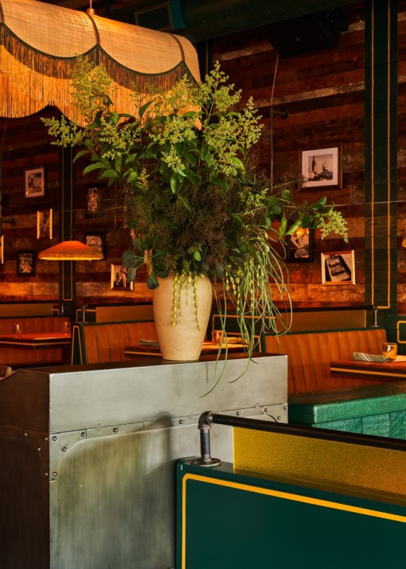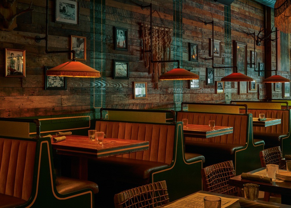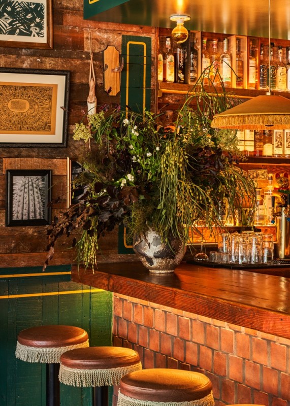 Drawing inspiration from the traditional vaquero, or cowboy, aesthetic, the design combines rustic tavern elements with layered colors and mixed textures. A palette of vibrant greens and yellows complements the building’s existing hacienda details and terracotta accents. Oil-painted portraits, taxidermy, neon signage and other vintage pieces (sourced by Egan from Mexico) punctuate the dimly lit interiors.