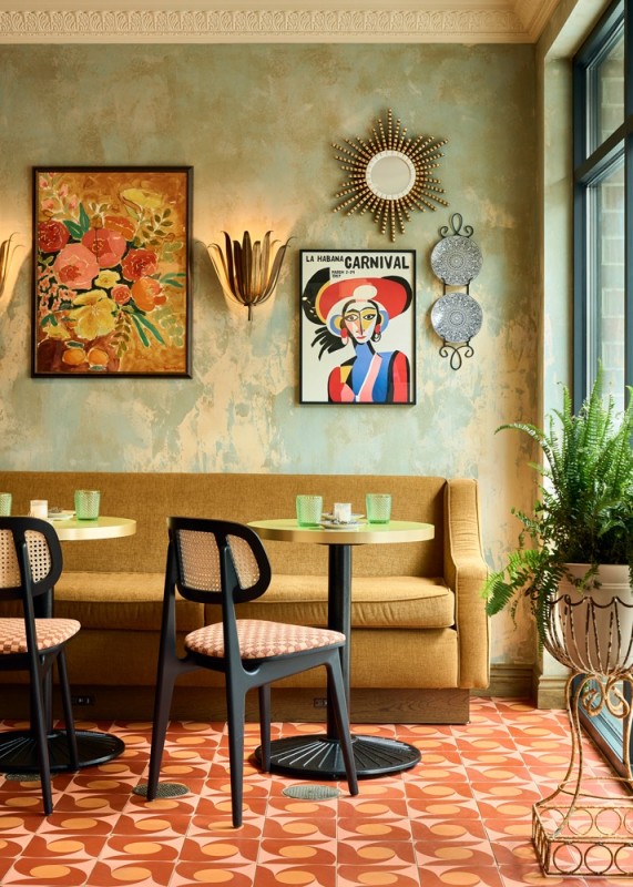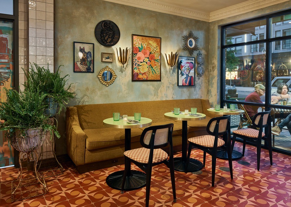 Guests are welcomed at a hand-painted to-go window serving espresso and empanadas before entering a vibrant lounge defined by aged cement tiles, patinaed walls and wrought iron detailing.
