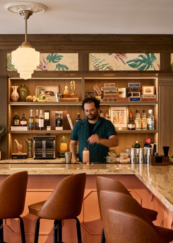 At its center, a sculptural pink and dark wood bar seamlessly transitions from day to night, illuminated by vintage pendant lighting and backed by a curated rum display with antique cigar boxes and brass pineapple tumblers. Thoughtfully placed artwork, curated objects, lush greenery and intimate seating create a warm, inviting atmosphere that encourages guests to linger.